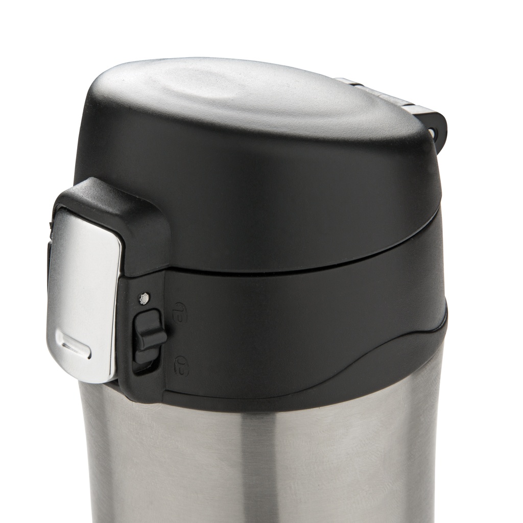 Kaksiseinämäinen vakuumipullo ruostumattomasta teräksestä, mikä pitää juomasi lämpimänä jopa 5 tuntia ja viileänä jopa 15 tuntia. Kansi on lukittava, mikä estää vuotojen mahdollisuutta. Kansi on helppo pitää puhtaana ja se voidaan pestä astianpesukoneessa. Tuotteen muotoilu mahdollistaa käytännöllisen ja turvallisen juomisen suoraan pullosta. Sopivan kokoinen auton juomatelineeseen. Kapasiteetti: 450ml.