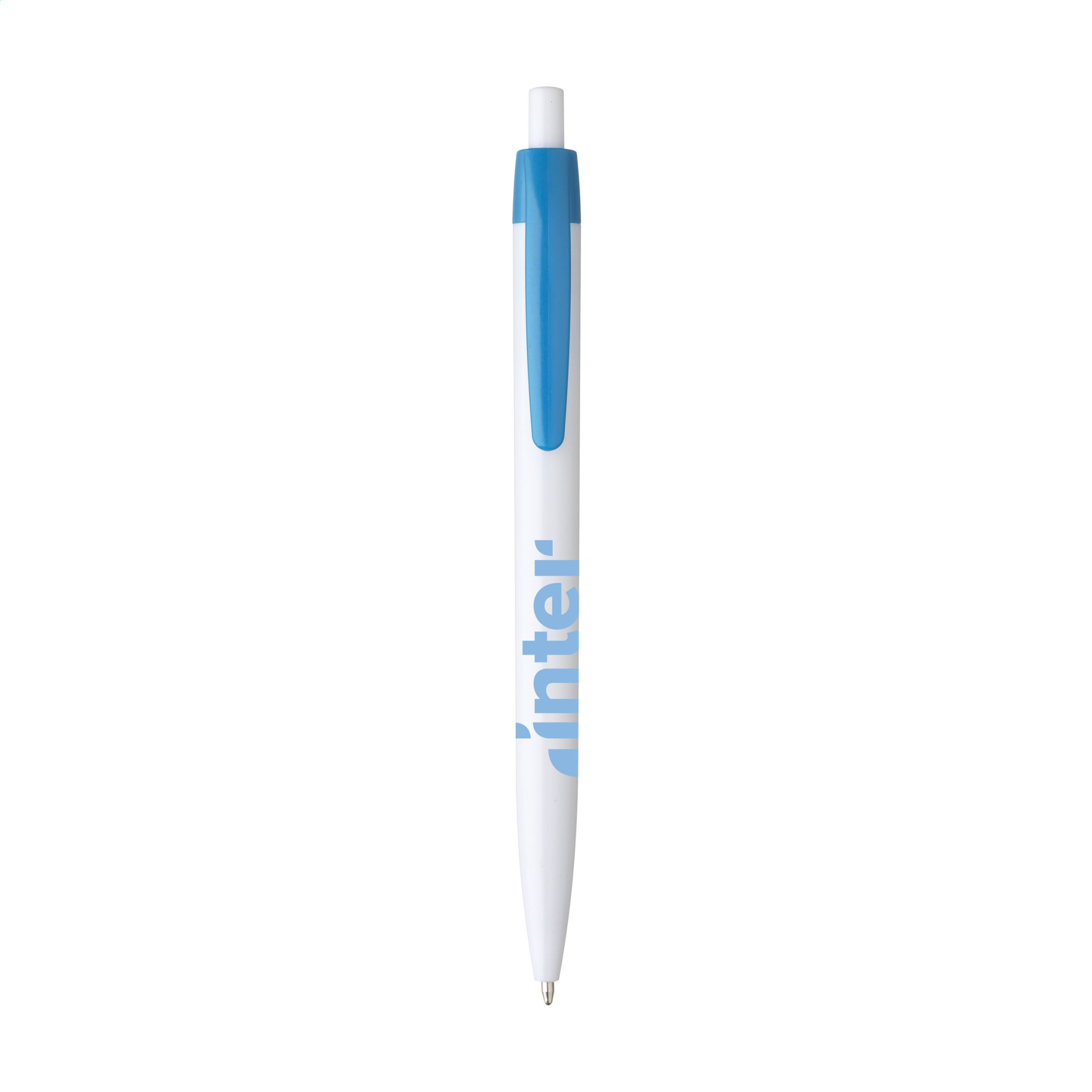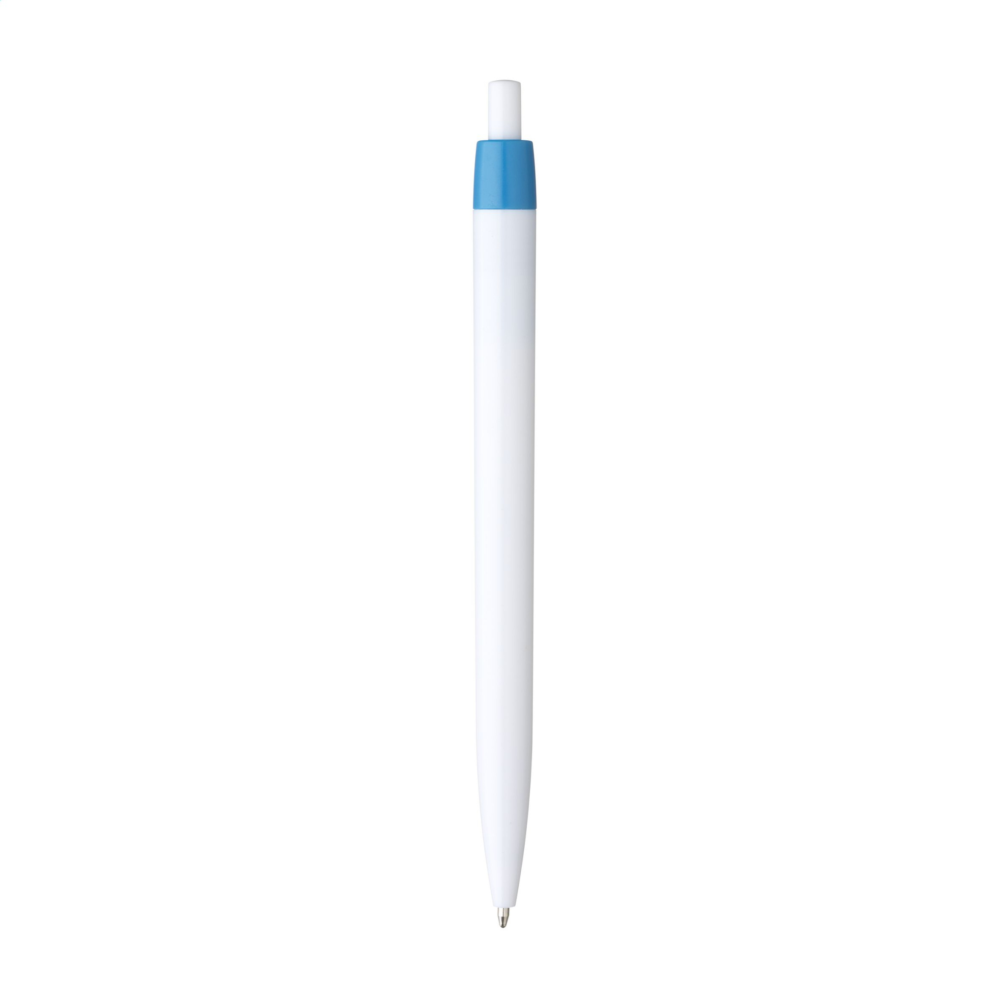 Yksiosainen kuulakärkikynä, jossa sininen muste ja valkoinen piippu. Tässä kynässä on suuri tulostusalue optimaalista tuotemerkkiä varten sekä silmiinpistävä, värillinen klipsi.