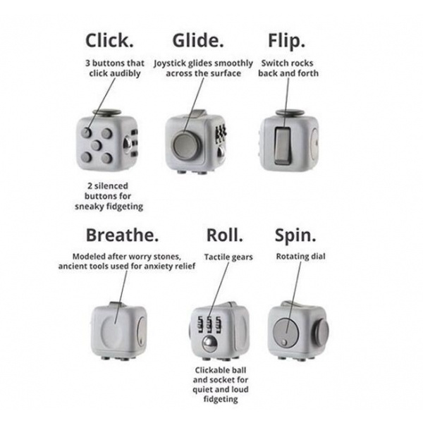 Fidget Cube on pöytälelu jokaiselle, joka haluaa hehkuttaa. Siinä on kuusi puolta. Kummallakin sivulla on jotakin, jonka parissa voi höpöttää: klikkaa, liuku, käännä, hengitä, rullaa, pyöritä.Fidget Cubea on saatavana 10 eri värimaailmassa: musta, keltainen, pinkki, vihreä, sininen, harmaa.