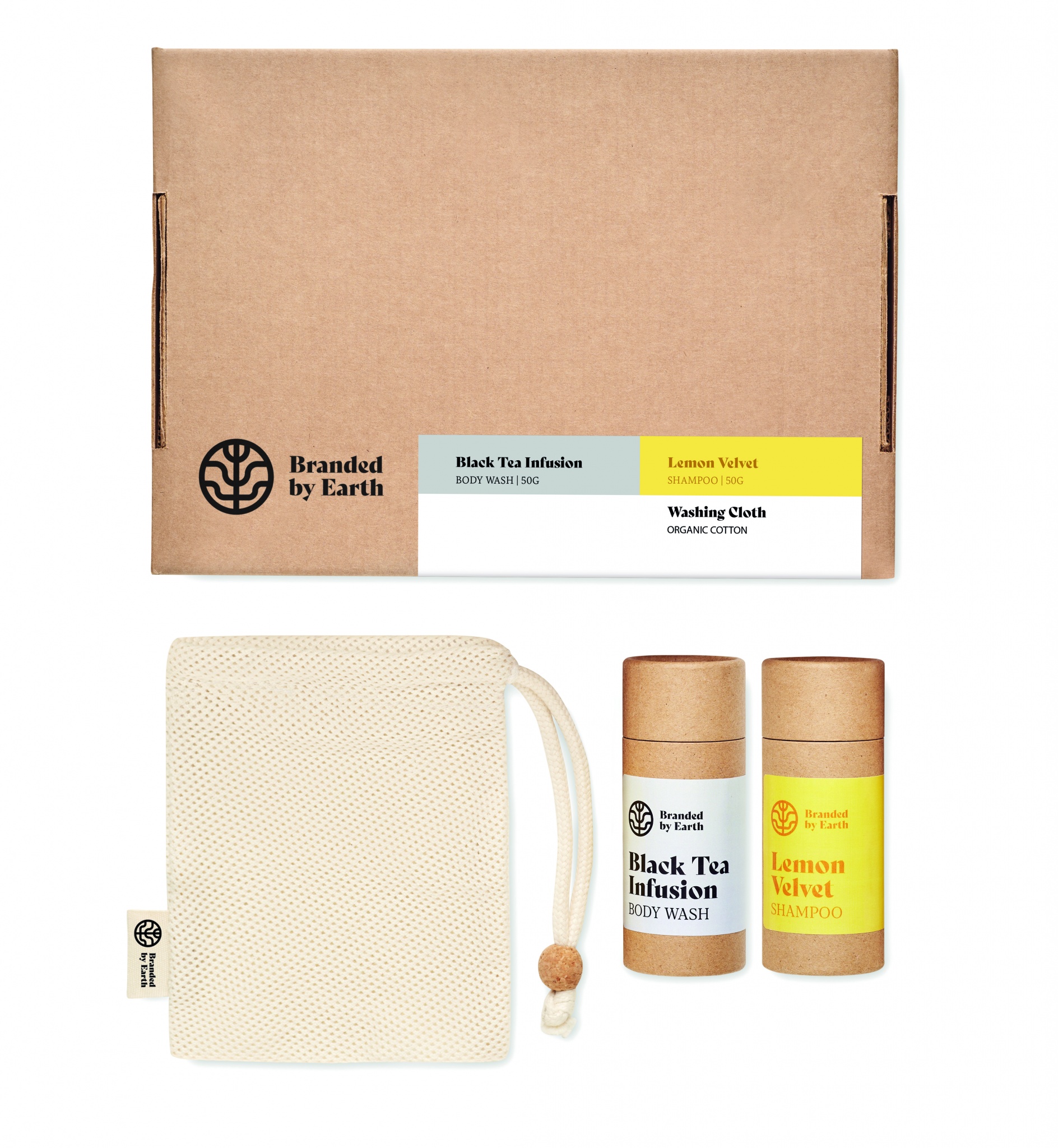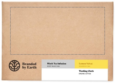 Branded By Earthin Unisex On the Go -lahjasetti, sisältää 24 vegaanista 4gr vartalopesuainetta, shampoon ja hantag-pesulapun luomupuuvillasta. Kaikki kappaleet pakattu tuubiin. Pakattuna kierrätyspaperista valmistettuun kartonkiseen putkeen, valmistusmaa EU.