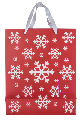 Iso paperista valmistettu joululahjapussi, jossa lumihiutalekuvio ja kaksi kahvaa. Painamme logosi tarraan.