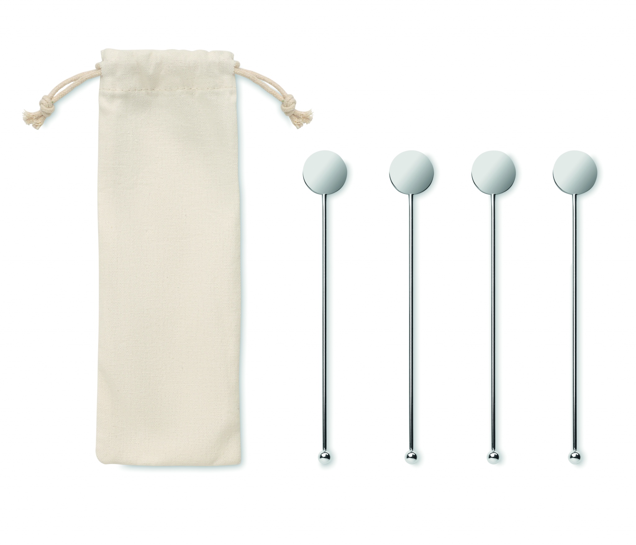 4 ruostumattomasta teräksestä valmistettua juomasekoitinta, puuvillapussissa.