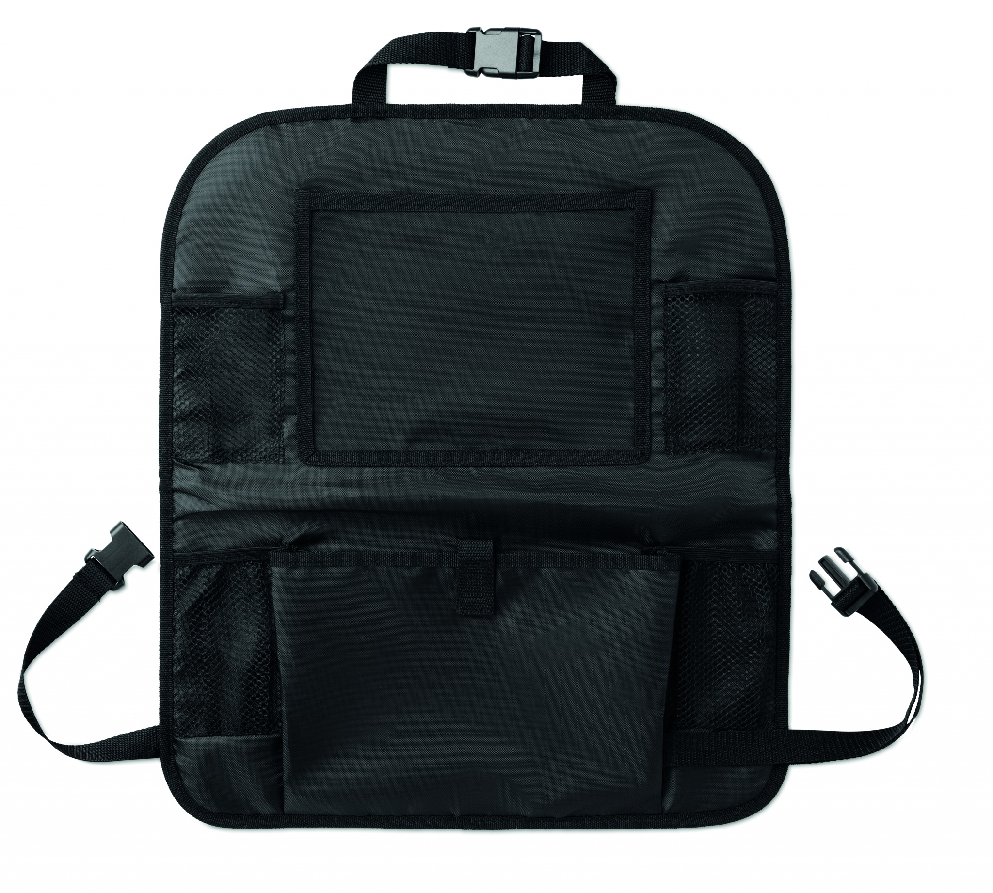 420D- polyesteristä valmistettu kangaslokerikko auton istuimen takaosaa varten, tuotteessa on useita erikokoisia lokeroita.