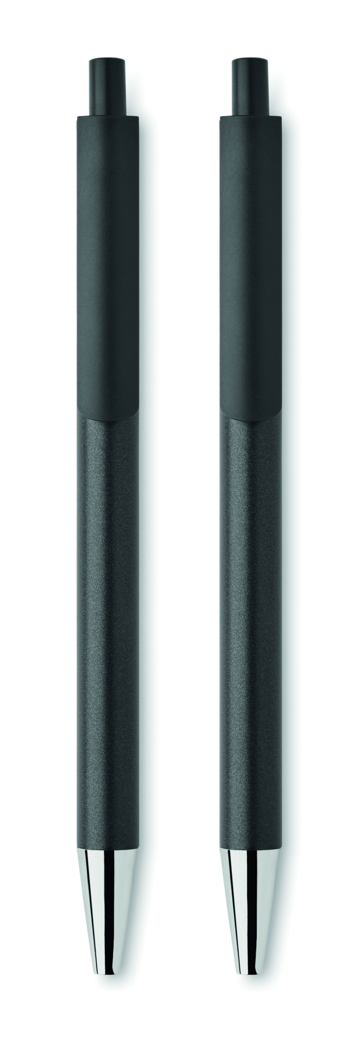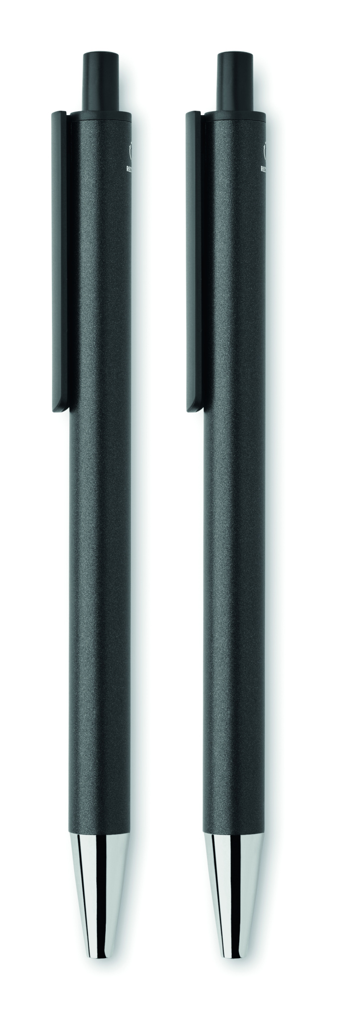 Kierrätetystä alumiinista valmistettu kynäsarja, jossa on 1 painonapin kuulakynä ja 1 musteton grafiittikynä. Sininen muste. Toimitetaan kierrätyspaperilaatikossa.