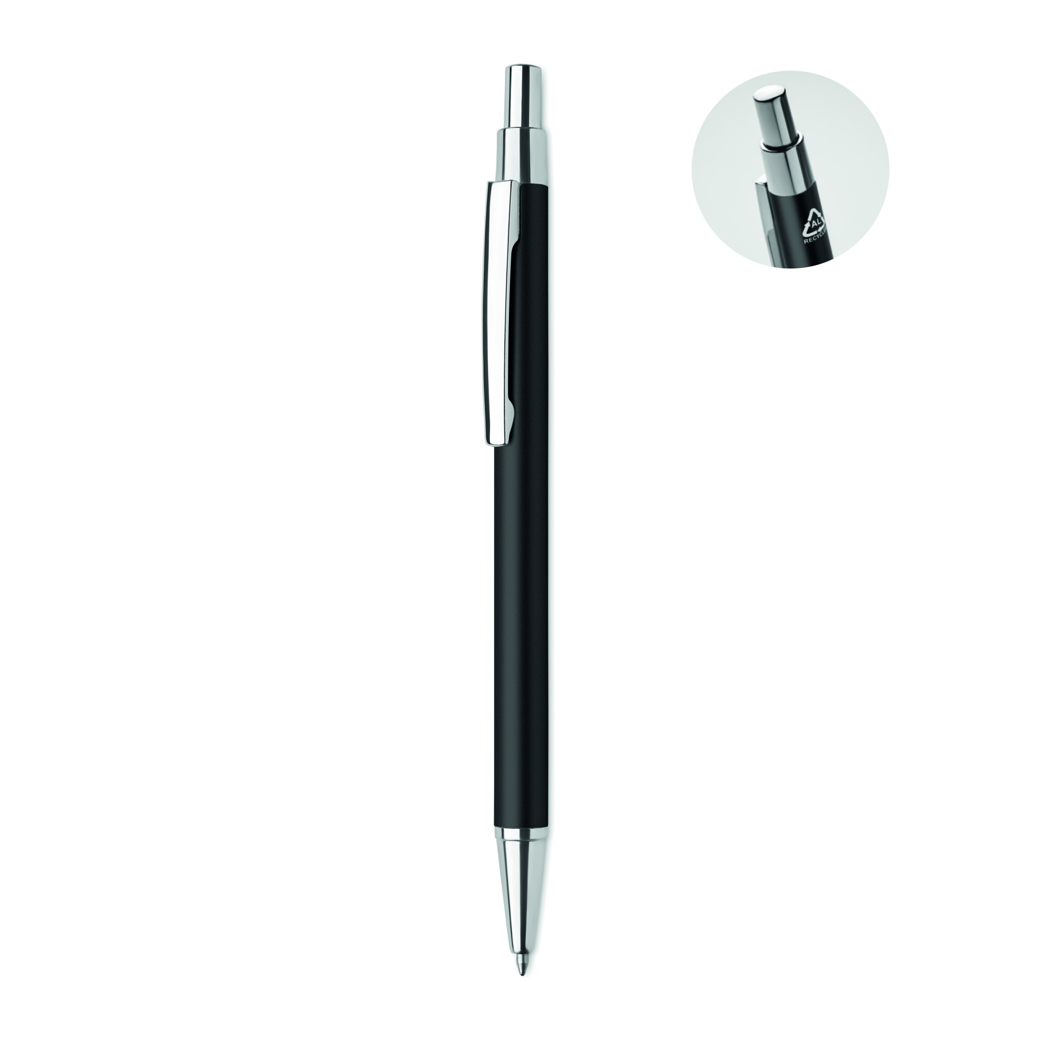 Kierrätetystä alumiinista valmistettu kuulakärkikynä sinisellä musteella.