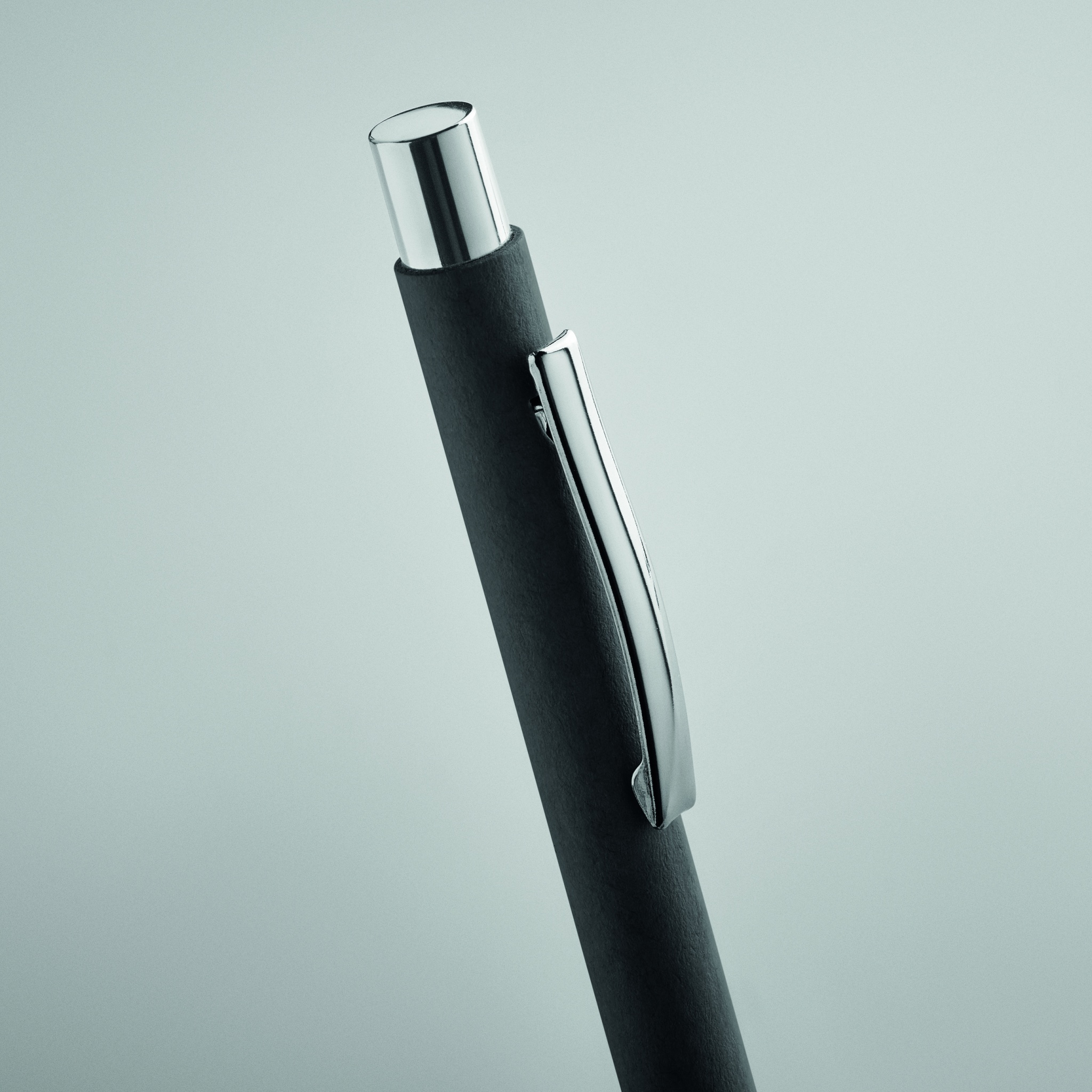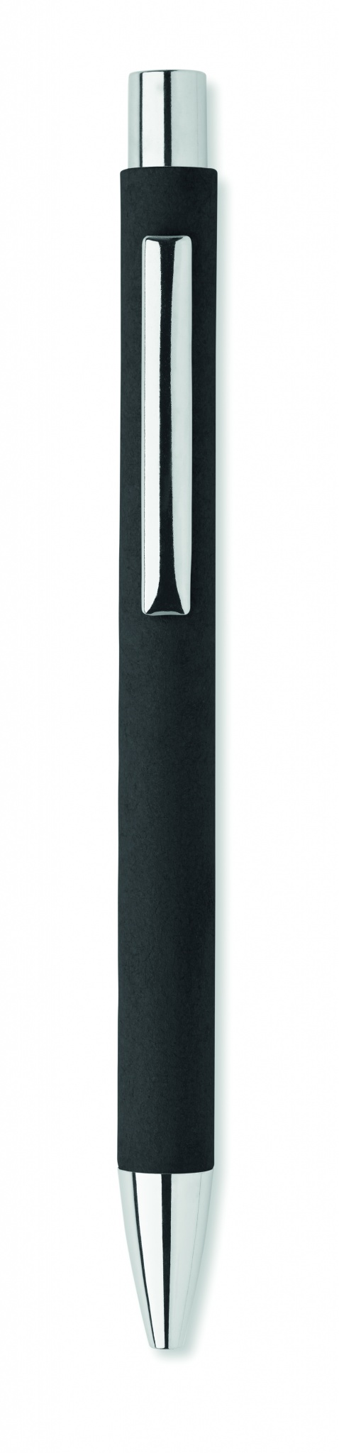 Kierrätyspaperista valmistettu painonappikuulakärkikynä, jossa on metallinen kärki ja klipsi. Sininen muste.