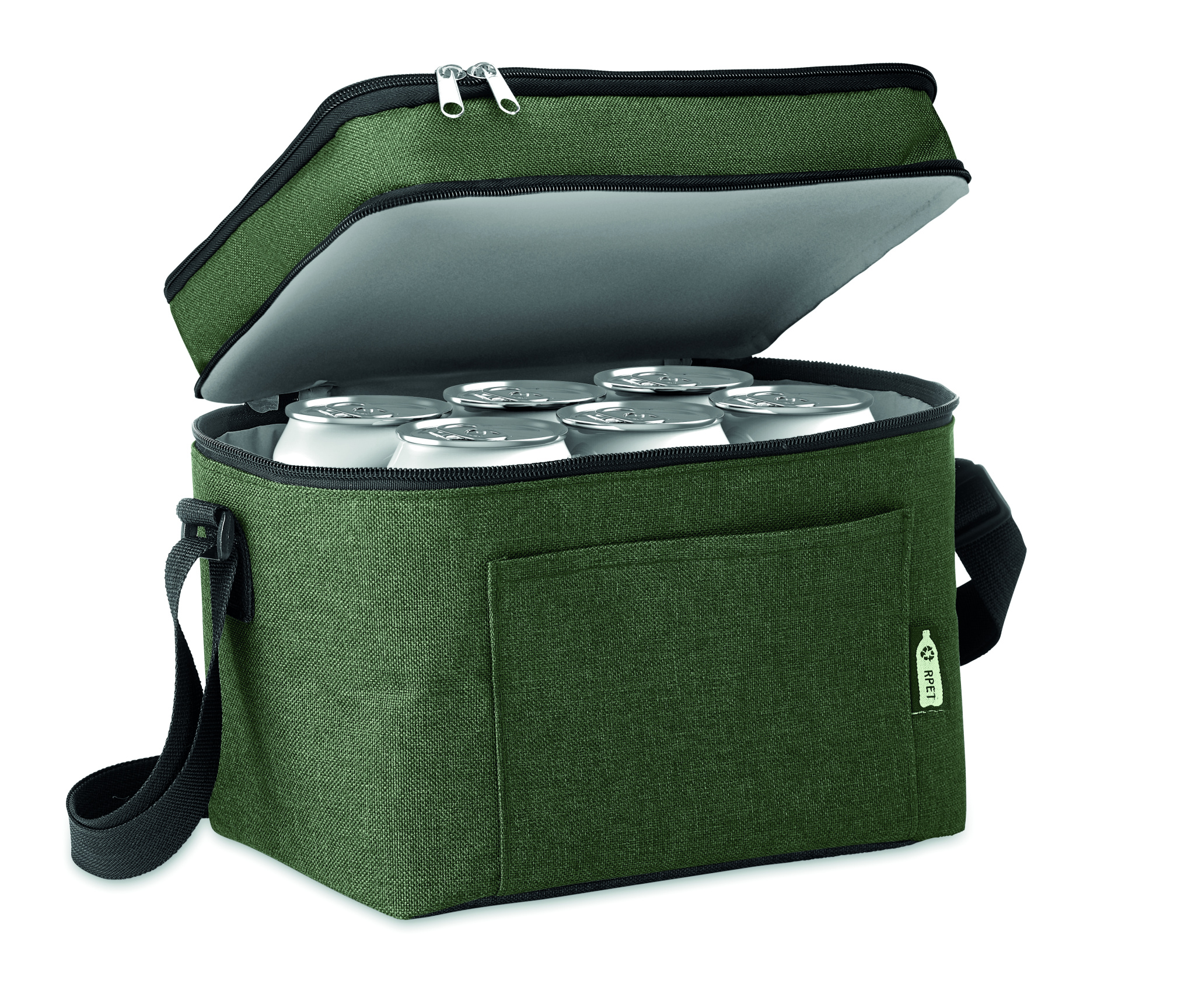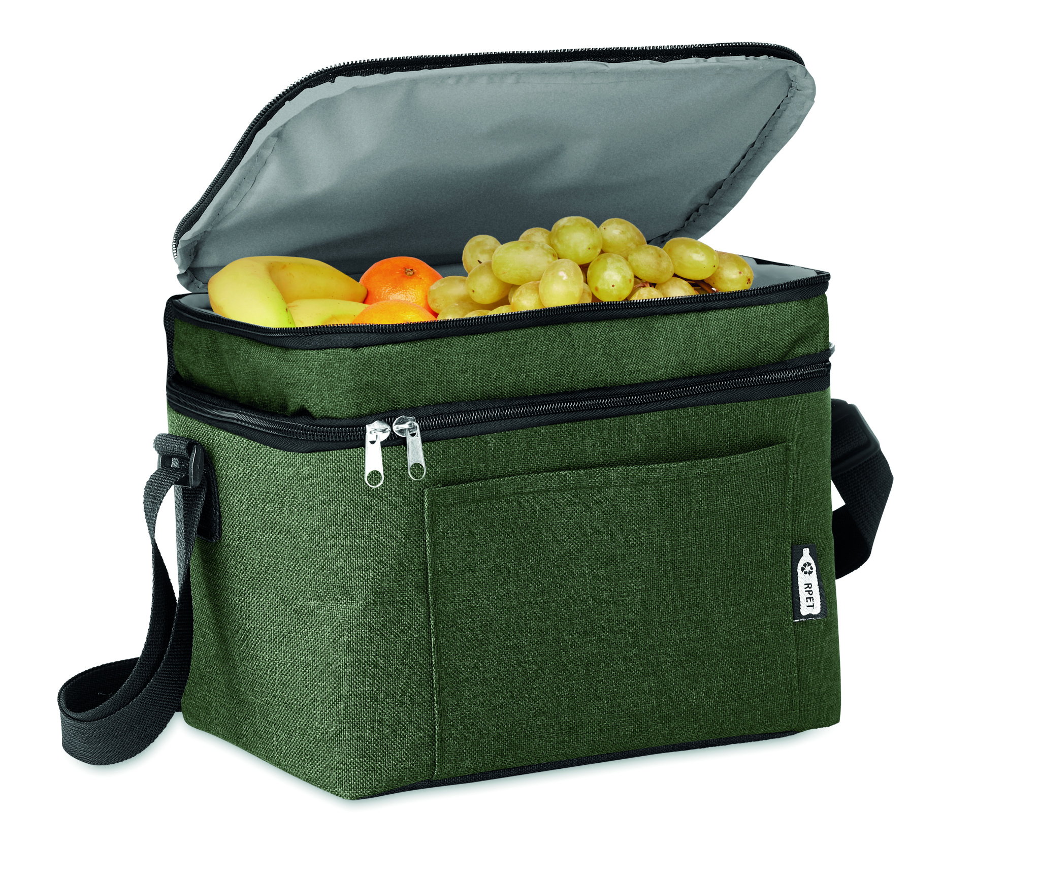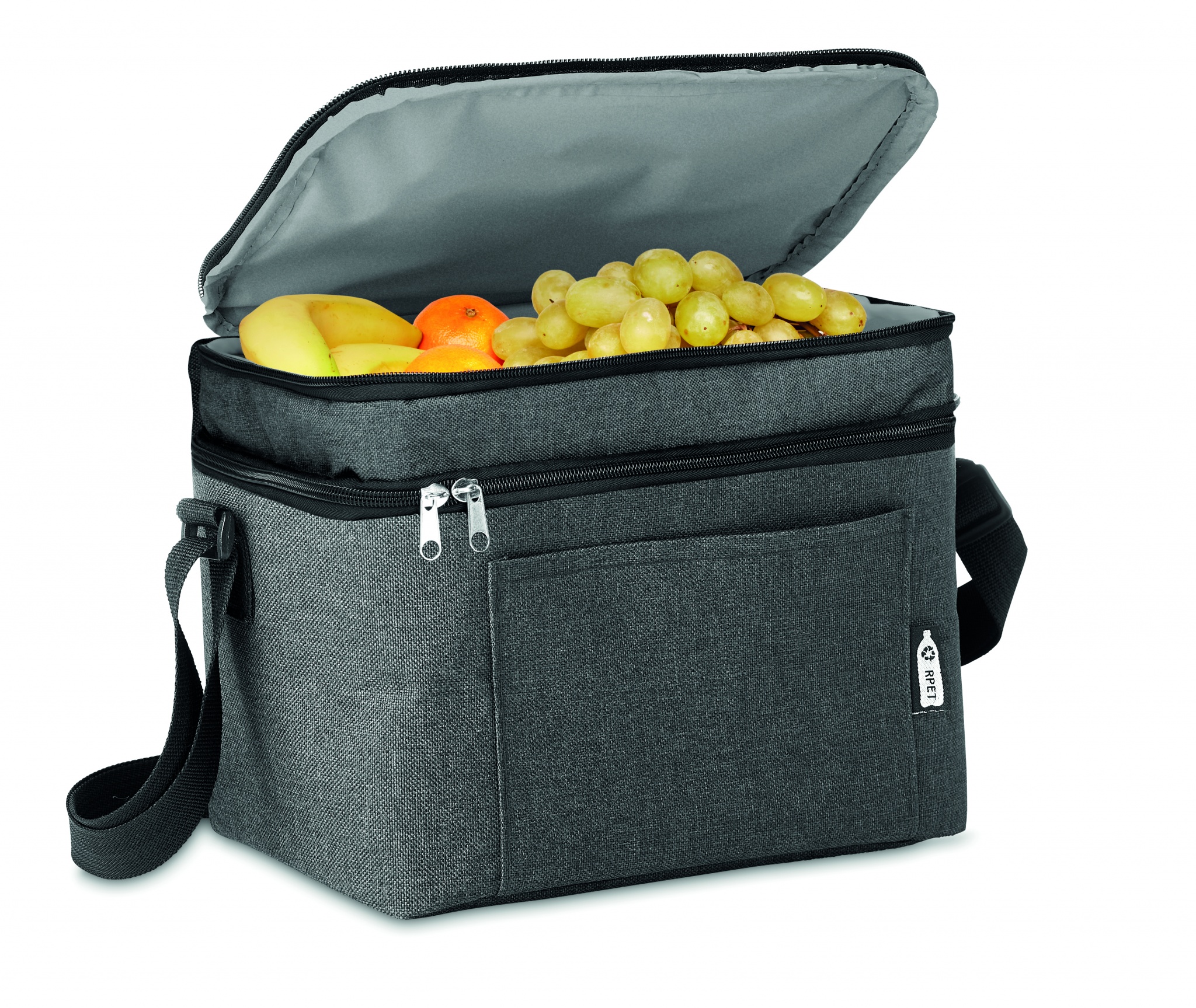 600D RPET 2- sävyinen kylmälaukku, 2 lokerolla ja PEVA vuorella. Sisältää taskun edessä ja säädettävän olkahihnan. Eristysmateriaalina 0,15mm PEVA + 3 mm vaahtomuovia.