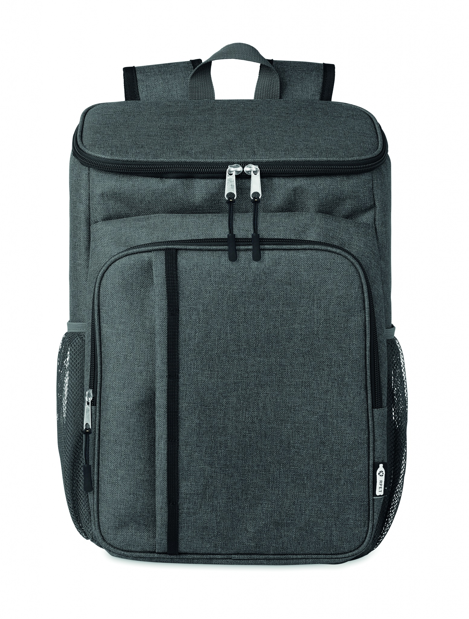 600D RPET- kylmälaukku-/ piknikreppu, sisältää 2 hengen ruokailutarvikkeet. Ruostumattomasta teräksestä valmistettu veitsi, PP- haarukan, lusikka ja kupin.