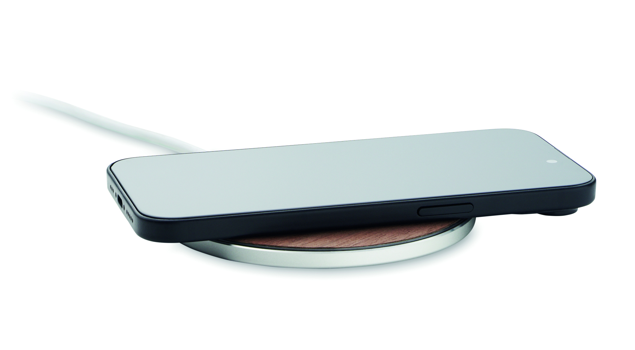 Kierrätetystä alumiinista valmistettu langaton laturi, jossa pähkinäväri. Liitä laite tietokoneeseen, aseta älypuhelin sen päälle ja anna sen latautua. Lähtö: DC 9V/1.67A (15W). Yhteensopiva kaikkien QI-yhteensopivien laitteiden, kuten uusimpien Androidien, iPhone® 8:n, X:n ja uudempien kanssa.