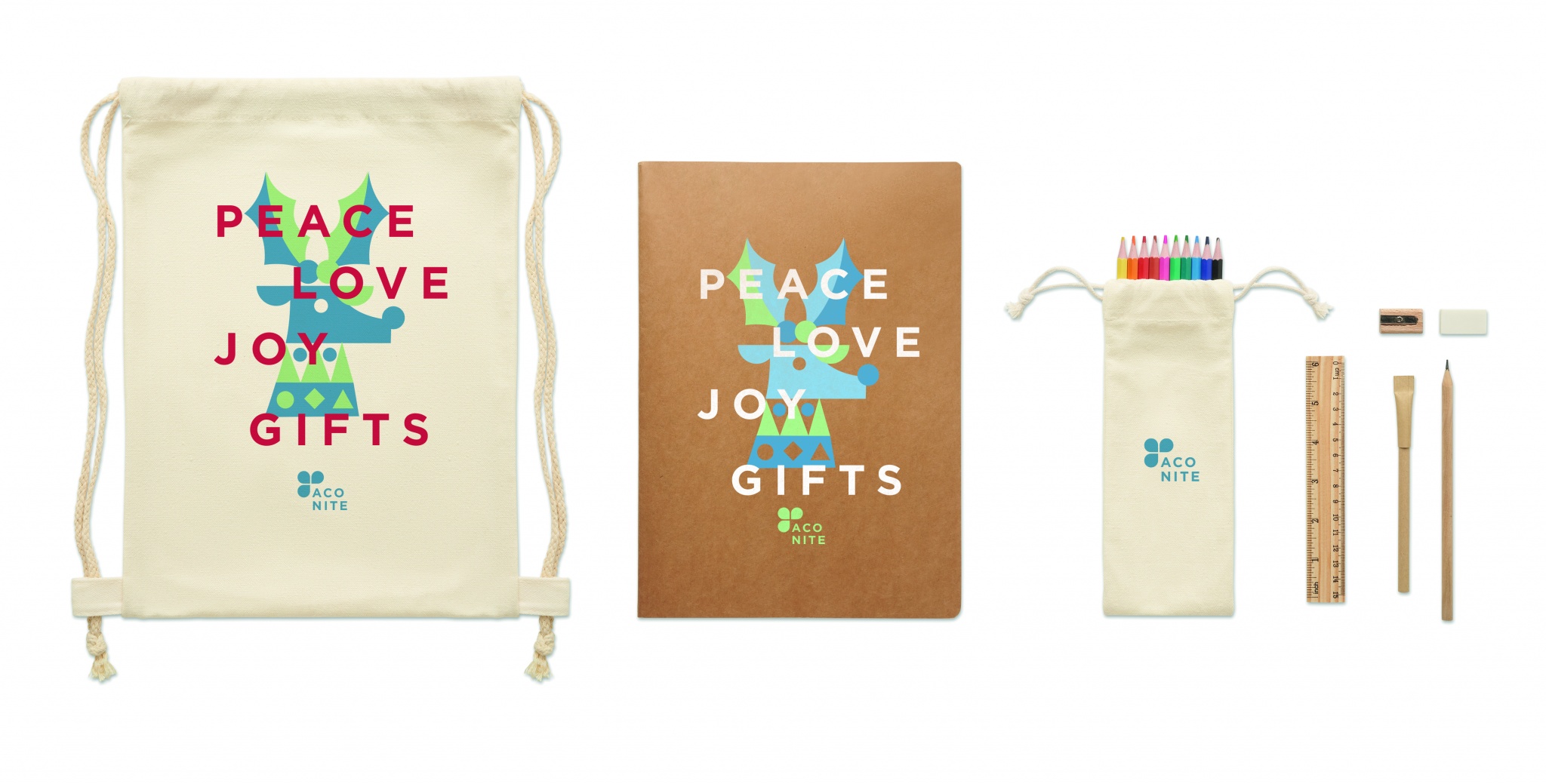 Lasten piirustusetti, joka sisältää puisen viivoittimen, puisen teroittimen, pyyhekumin, puisen lyijykynän ja pahvisen kuulakynän. Lisäksi 10 värikynää, A4-kierrätyspaperi 50 tavallista arkkia (100 sivua). Puuvillaisessa kiristysnauhapussissa.