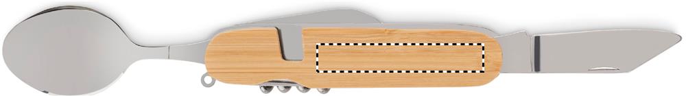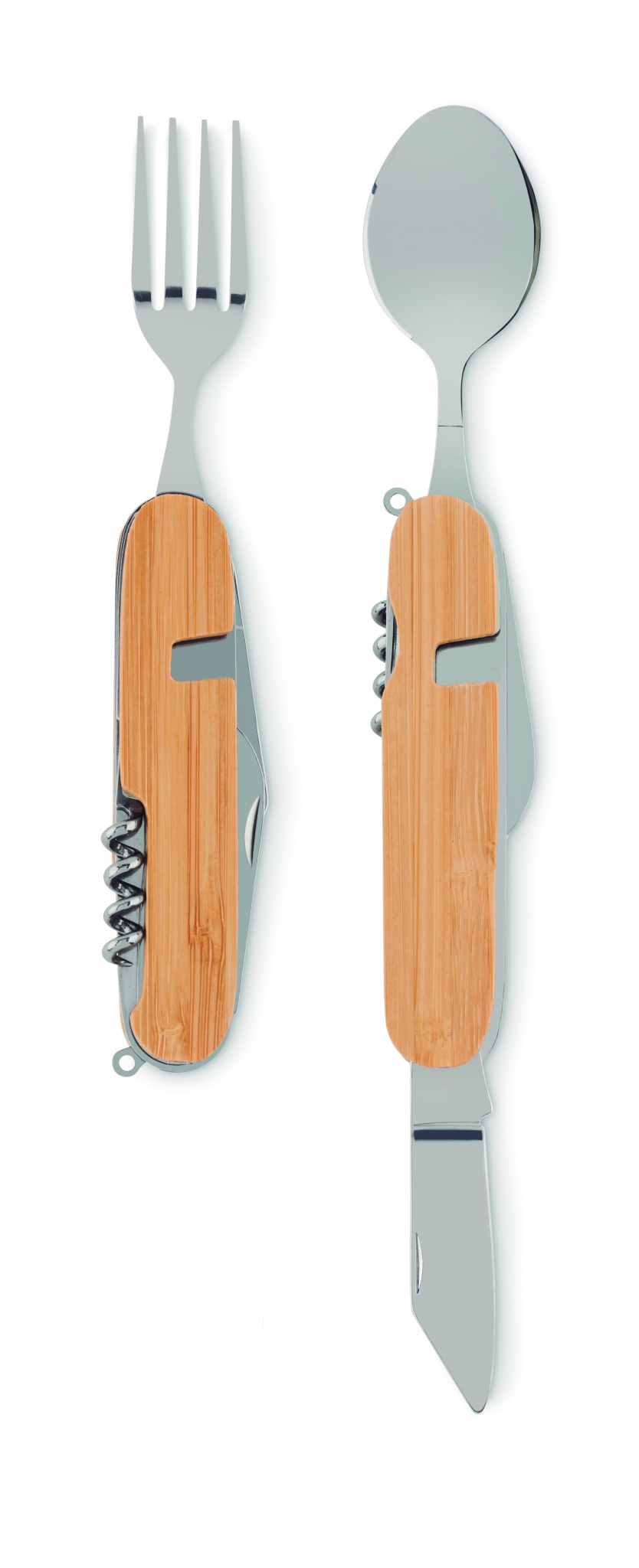 Metallinen linkkuveitsi ruokailuvälineillä ja puisella kuorella. 5 erilaista toimintoa, lusikka, haarukka, avaaja, viinipullon- ja veitsi. Luonnollisen materiaalin vuoksi, tuotteiden värissä/ koossa saattaa olla erinäisyyksiä ja tämä voi vaikuttaa painatuksen lopputulokseen.
