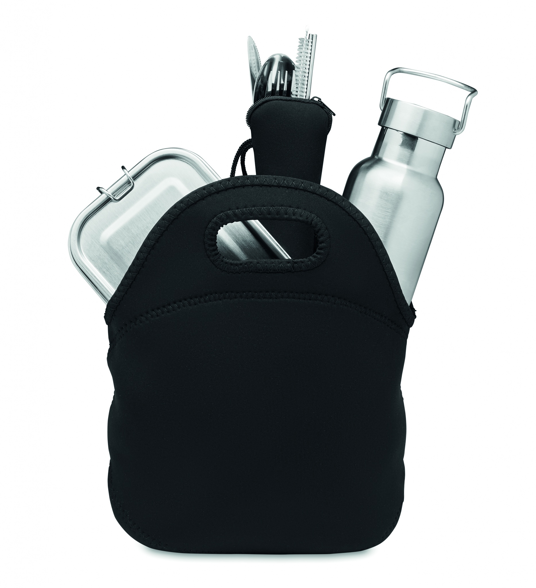 Lounassetti neopreenipussissa. Sisältää kaksiseinäisen ruostumattomasta teräksestä valmistetun termospullon (500 ml) , lounasrasian (600 ml) ja ruokailuvälineet vetoketjullisessa neopreenipussissa.