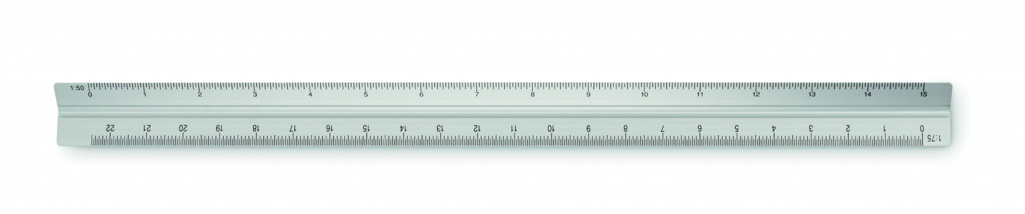 Kolmionmuotoinen mittasuhdeviivain, kolmella sivulla yhteensä viisi eri mitta-asteikkoa: 1:20/1:25/1:50/1:75/1:100. Materiaali alumiini.