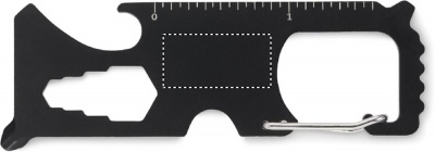 Ruostumattomasta teräksestä valmistettu monitoimityökalu taskukokoisena. 8 toimintoa. Sisältää: hammassaha, lankaleikkuri, jakoavain, Phillips-ruuvimeisseli, urainen ruuvimeisseli, mitta-asteikko, pullonavaaja ja avaimenperä.