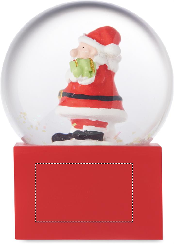 Pieni jouluinen lasinen lumipallokoriste, jossa on polyresiinipohja.