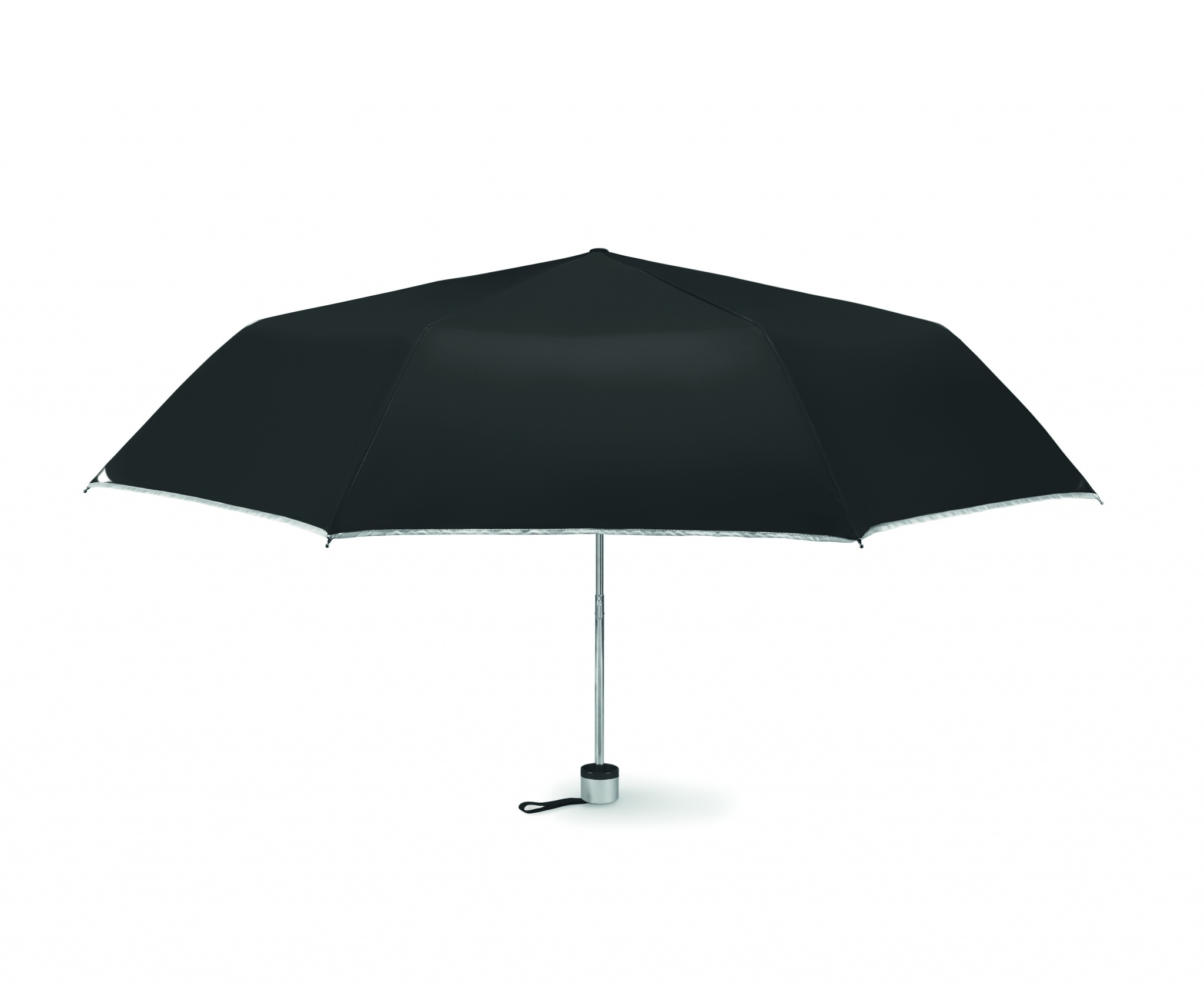 190T polyesterinen 21 tuuman sateenverjo, manuaalinen avaus. Sinkillä pinnoitettu metallivarsi ja kärjet. Mustalla päällystettyt metalli ruoteet, ulkoiset värilliset paneelit sisäpuolelta hopea maalipeite. Värillinen muovikahva hopealla reunalla ja mustalla rannehihnalla. Taitettavissa kolmeen osaan, sisältää tuotteelle tarkoitetun säilytyspussin, hopealla reunuksella. Manuaalinen suljin.