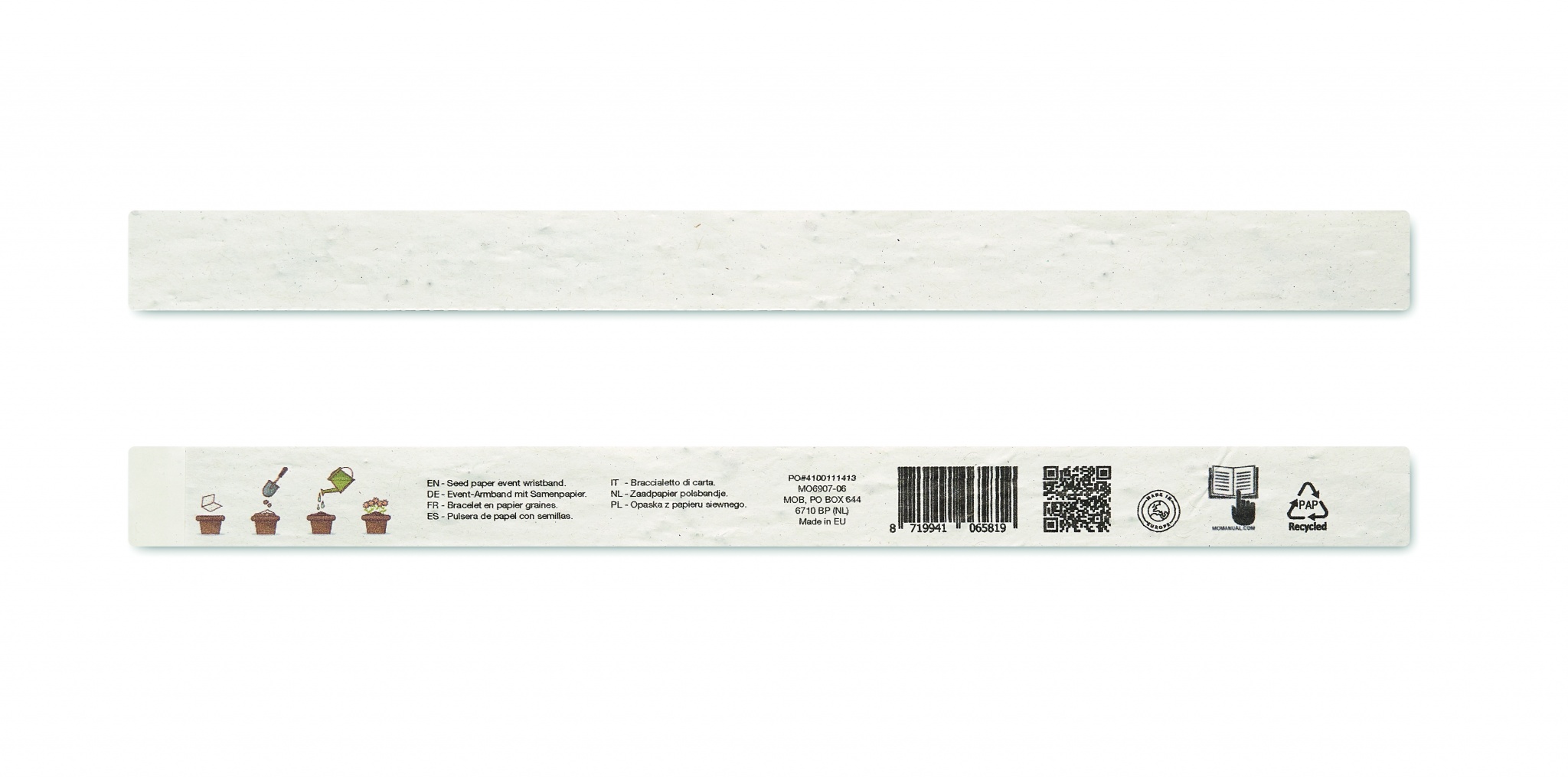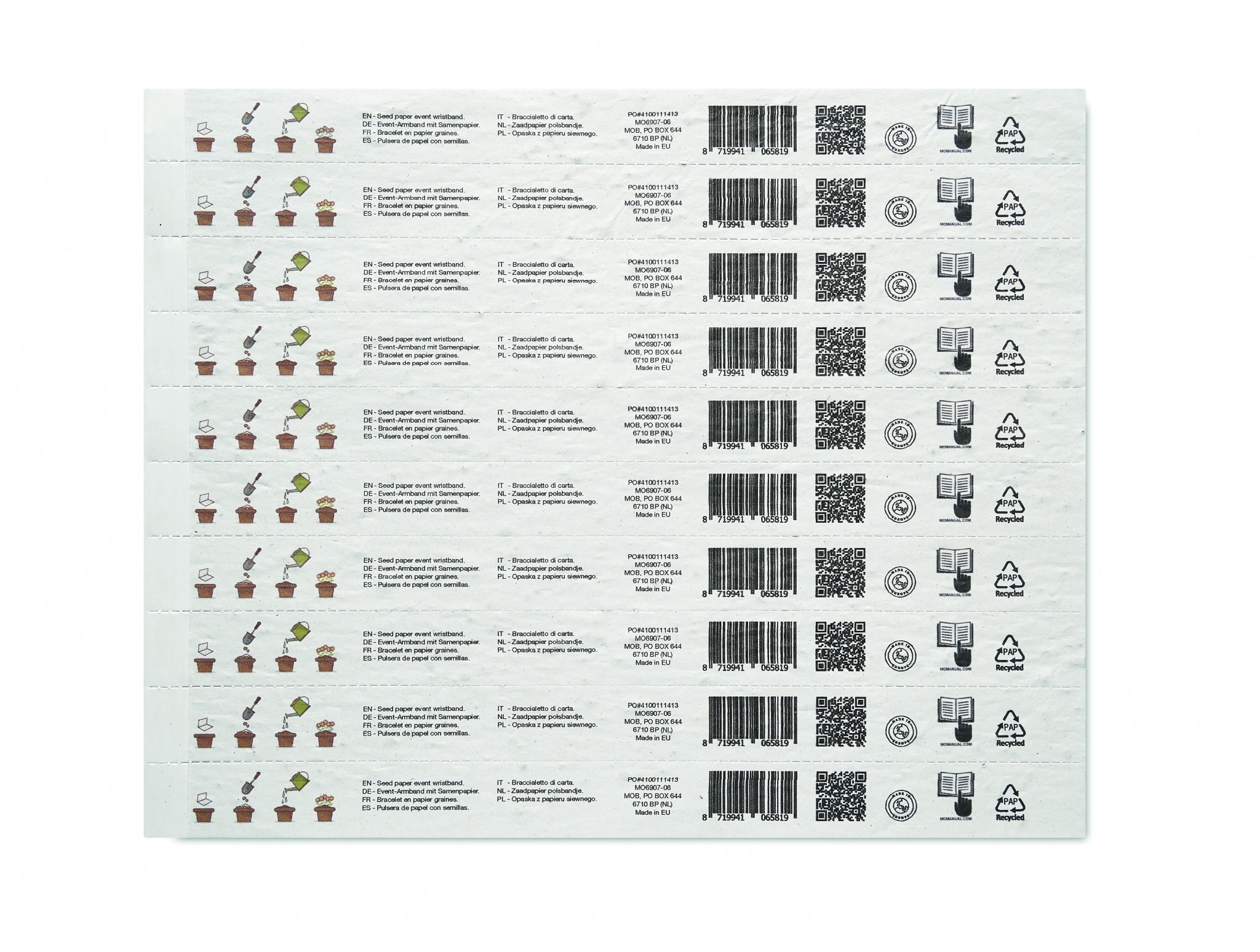 Yhdessä arkissa 10 tapahtumaranneketta. Niittykukkien siemeniä kierrätyspaperista valmistetussa nauhassa. 19mm leveä. Valmistettu EU:ssa.