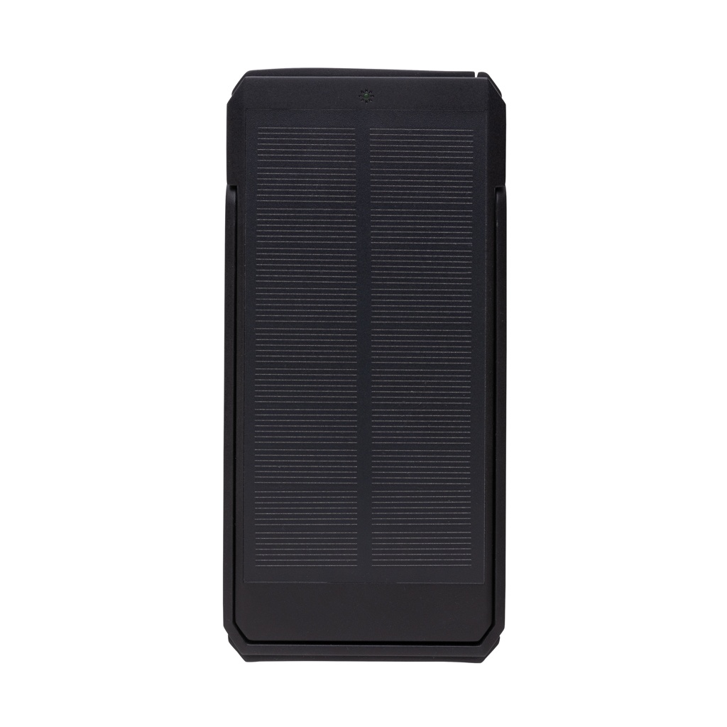 10 000 mAh aurinkovoimapankki, joka on valmistettu RCS-sertifioidusta kierrätetystä ABS-muovista. Kierrätetyn materiaalin kokonaismäärä: 18% tuotteen kokonaispainosta. RCS-sertifikaatti varmistaa kierrätetyn materiaalin täysin sertifioidun toimitusketjun. Virtapankki käyttää laadukkaita yksikiteisiä aurinkopaneeleja, joiden muuntosuhde on 19%. Latausnopeus riippuu olosuhteista. Pankissa on integroitu teline, jonka avulla aurinkopaneeleja voi käyttää optimaalisessa kulmassa. Pankissa on kestävä A-luokan 10 000 mAh litiumakku. Latausnopeus aurinkovoimalla: 5V/200mA. Syöttö tyyppi C: 5V/2A. Lähtö: USB A: 5V/2A Tyyppi C: 5V/2A. Tuote ja tarvikkeet ovat PVC-vapaita. Mukana RCS-sertifioitu kierrätetty TPE-latauskaapeli. Pakattu FSC®-sekoitepakkaukseen. Rekisteröity malli®.