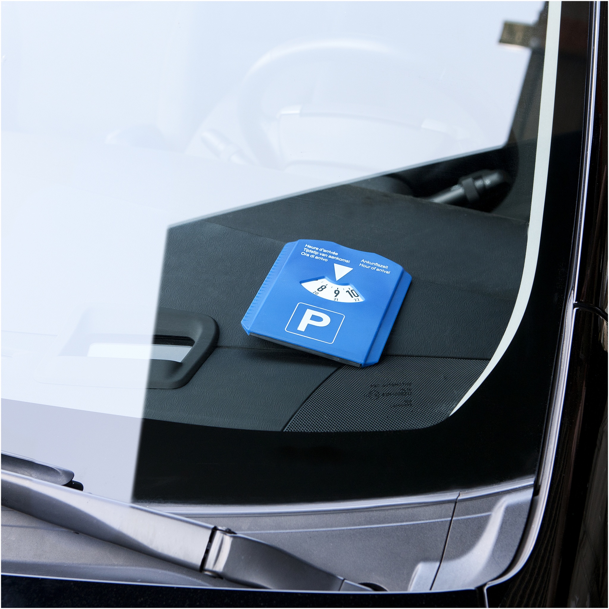 Pysäköintikiekko, jossa on mukana jääkaavin, kumipyyhin, ostoskärrykolikko ja rengaspainemittari. Kiekon takaosassa on suuri valkoinen logoalue. “Hour Of Arrival” -saapumisteksti on hollanniksi, englanniksi, ranskaksi, saksaksi ja italiaksi. Säännökset voivat paikallisesti vaihdella.