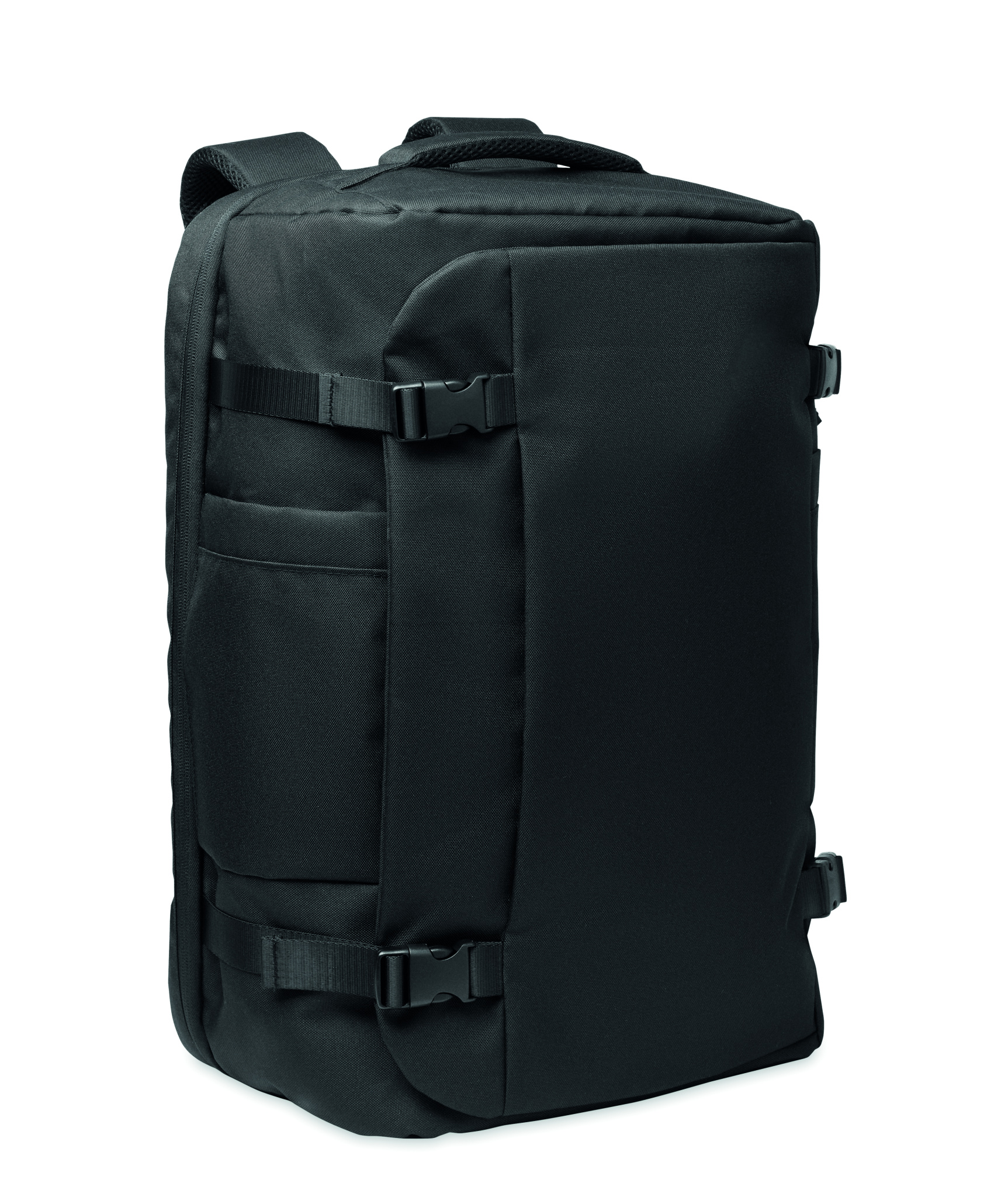 Suuri 17 tuuman kannettavan tietokoneen reppu 600D RPET -polyesteriä. Useita lokeroita: yksi päälokero vaatteille ja kaksi pehmustettua lokeroa kannettavalle tietokoneelle ja tabletille sekä muille tavaroille. Pehmustettu selkäpaneeli, olkahihna ja kädensija.