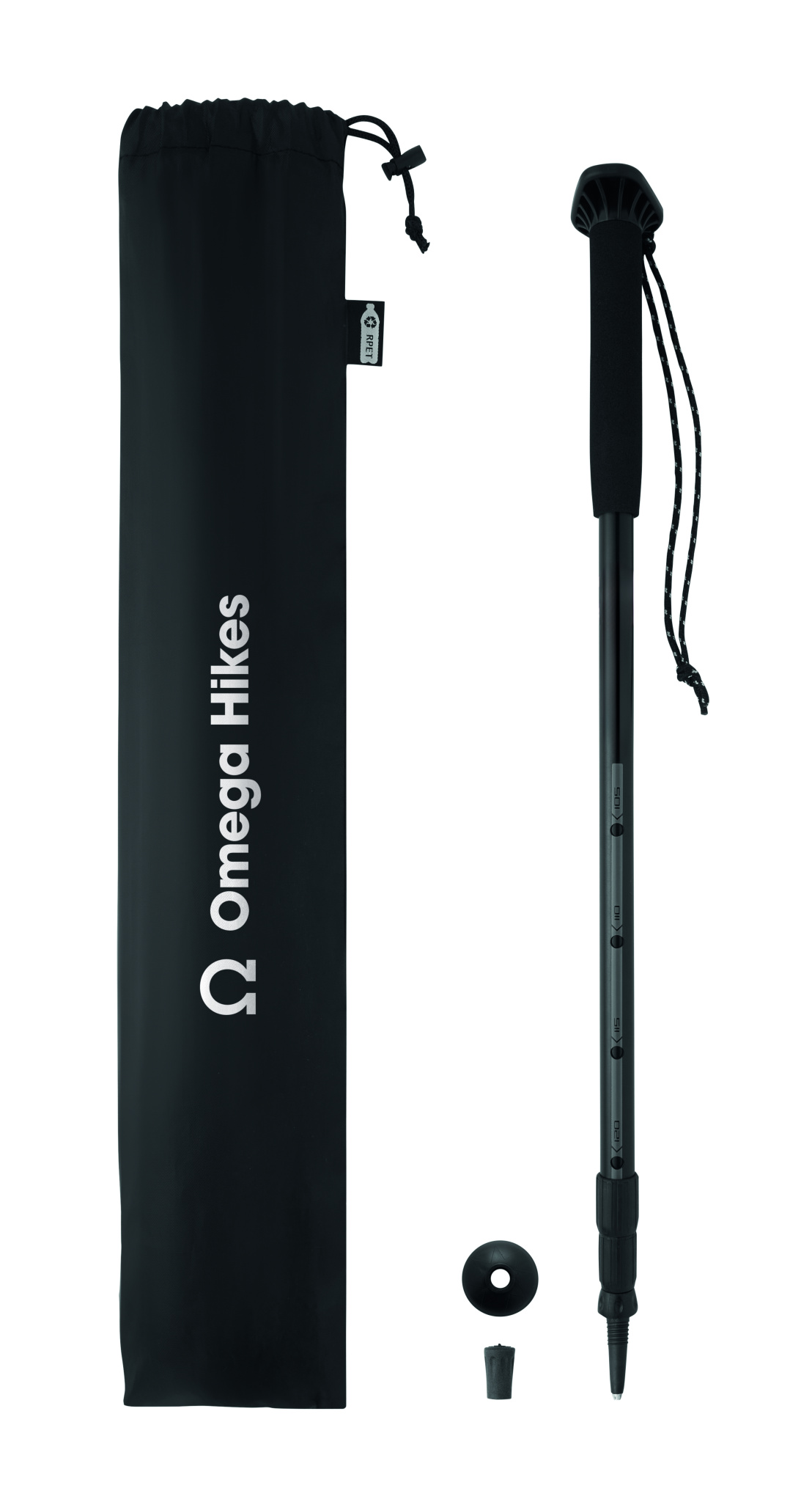 Teleskooppikävelysauva, jossa on EVA-kahva, rannehihna, kuminen kärki ja mutakori. Säädettävissä 105-120 cm. Pakattu RPET-vetoketjupussiin. Kevyt ja kestävä rakenne.