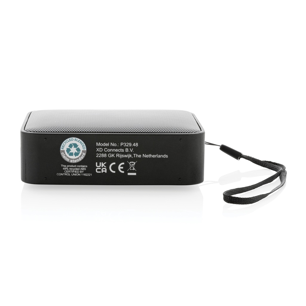 Taskukokoinen ja tehokas 3W langaton kaiutin valmistettuna RCS (Recycled Claim Standard) sertifioidusta kierrätetystä ABS:stä. Kierrätetyn materiaalin kokonaismäärä: 49% perustuen tuotteen painoon. RCS sertifiointi varmistaa kierrätettyjen materiaalien täysin sertifioidun toimitusketjun. Tämä mainio kaiutin on IPX 7 -vedenkestävä, joten se kestää vettä ja sopii siksi mukaanotettavaksi rannalle tai uima-altaalle. Kaiuttimessa on BT5.1, joka takaa jopa 6 tunnin toistoajan. Urban Vitamin -tuotteet ovat PVC-vapaita, ja ne on pakattu pakkauksiin, joissa on käytetty vähemmän muovia. Sisältää tyypin C latauskaapelin, joka on valmistettu RCS-sertifioidusta kierrätetystä TPE:stä.