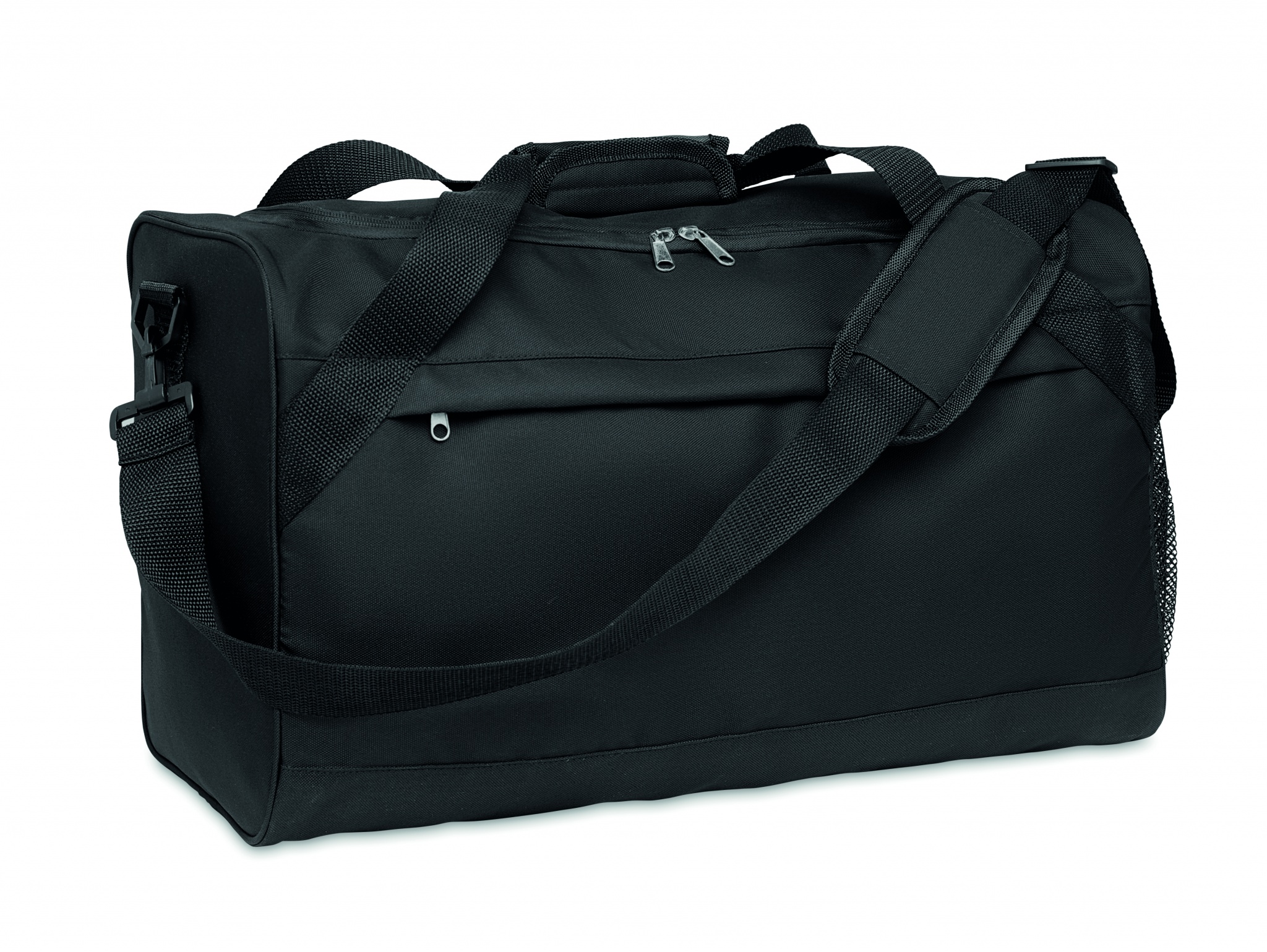 600D RPET urheilulaukku, iso vetoketjullinen etutasku, sisätasku ja säädettävä olkahihna.