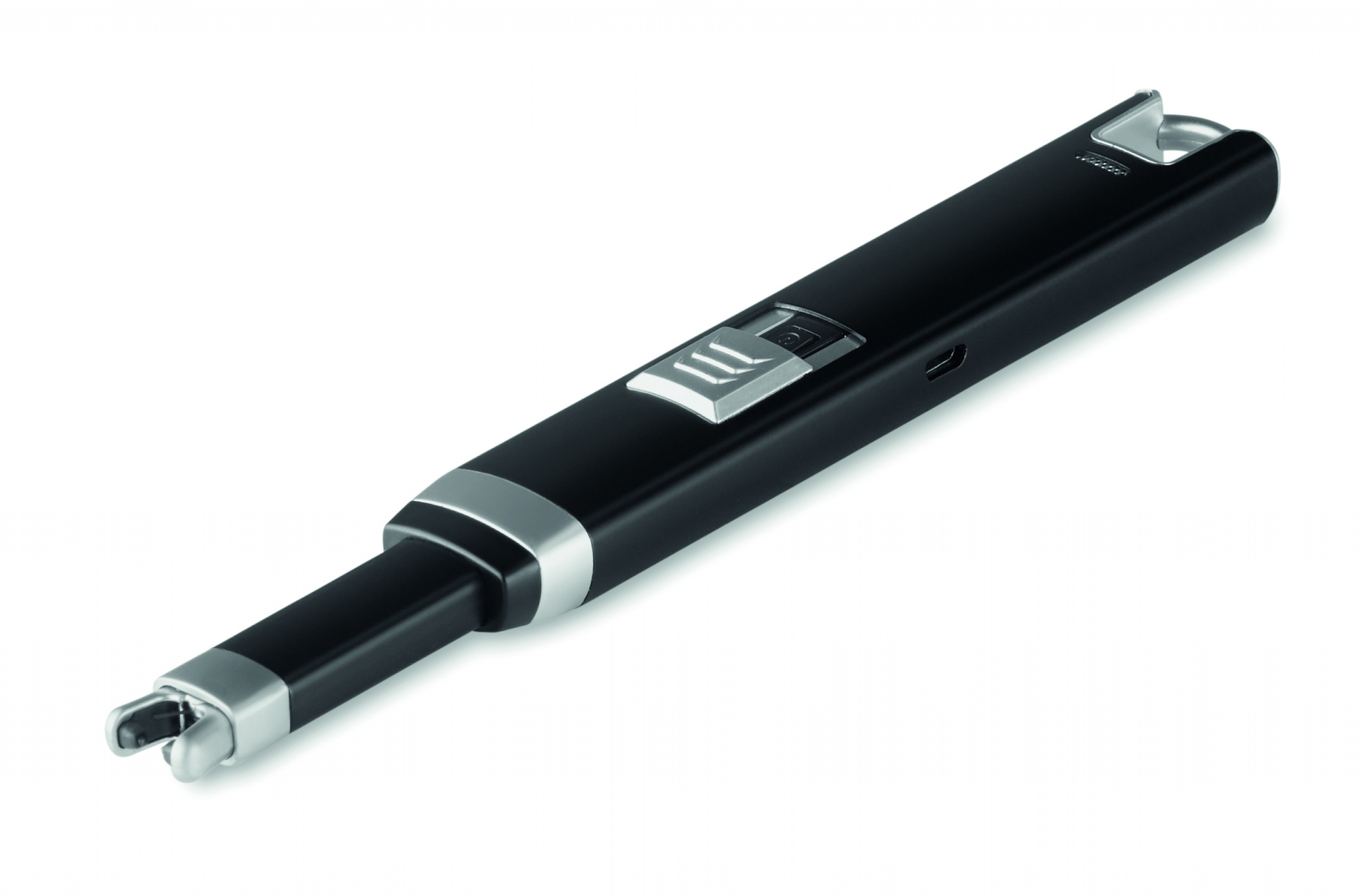 USB ladattava sytytin yksikaarisella liekillä, sisältää ladattavan 220 mAh litium akun ja USB latauskaapelin.