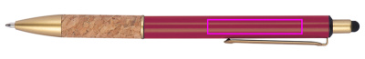Metalinis rutulinis rašiklis su aukso spalvos aplikacijomis, mėlynu rašikliu ir kamščio sugriebimo zona. Jūsų logotipas bus išgraviruotas klipo dešinėje.
