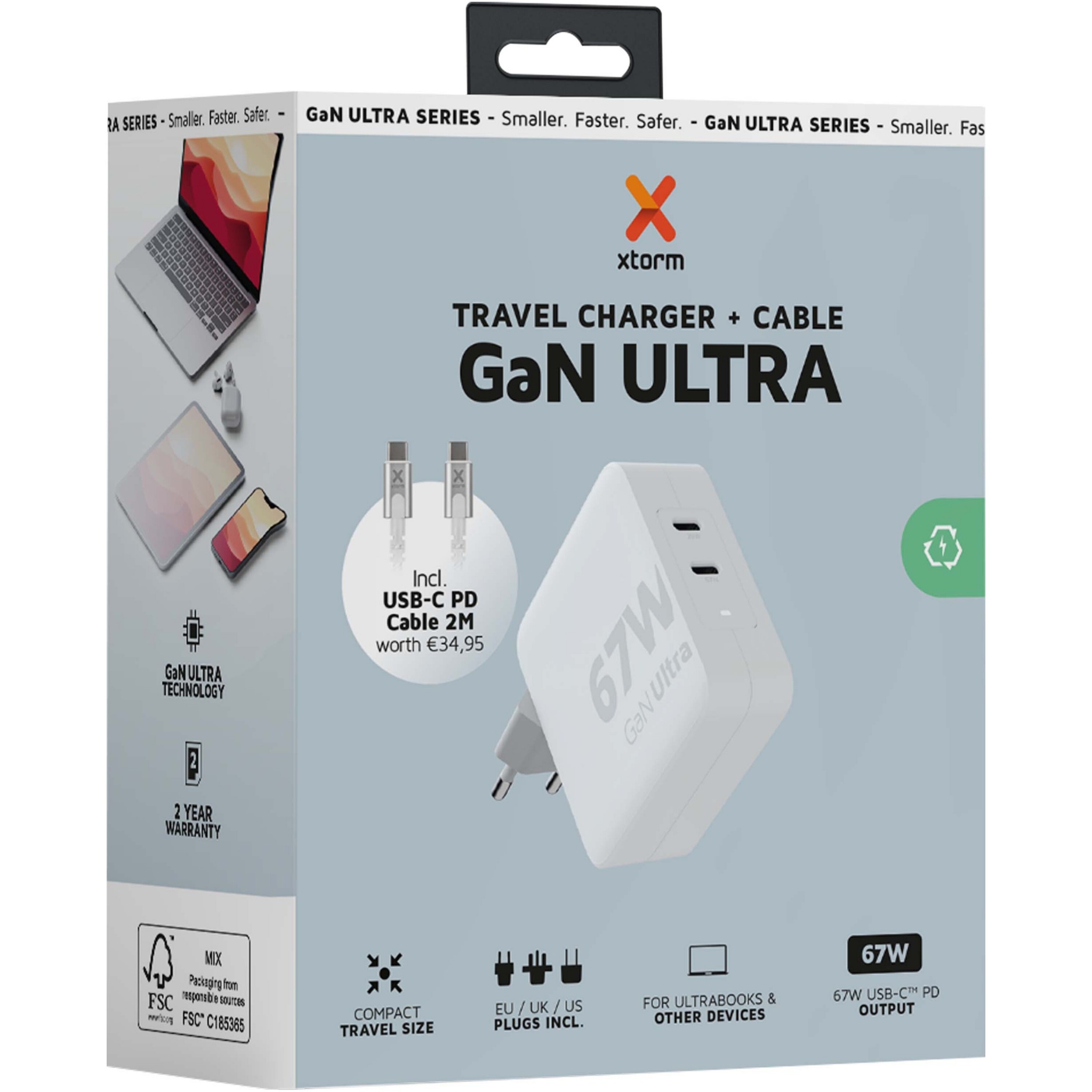 67 W GaN Ultra ceļojumu lādētājs ir veidots tā, lai tas būtu kompaktāks un jaudīgāks nekā jebkad agrāk. Ar savu kompakto dizainu un divu portu funkcionalitāti šis ceļojumu lādētājs ir lieliski piemērots jūsu ceļojumiem, birojam vai mājām. Izmantojot komplektācijā iekļautās ES, Apvienotās Karalistes un ASV, maiņstrāvas spraudņa iespējas un 100 W USB-C PD kabeli (2 metri), jums ir viss nepieciešamais, lai uzlādētu ierīces visā pasaulē!