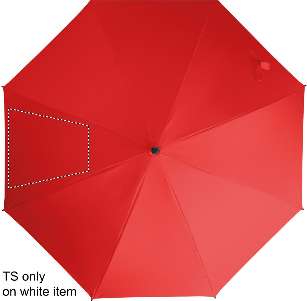 23 inch straight auto open windproof umbrella with full fibreglass frame and panels in 190T pongee fabric. Plastic tips and top. Rubberized PP plastic curved handle. Manual closure.