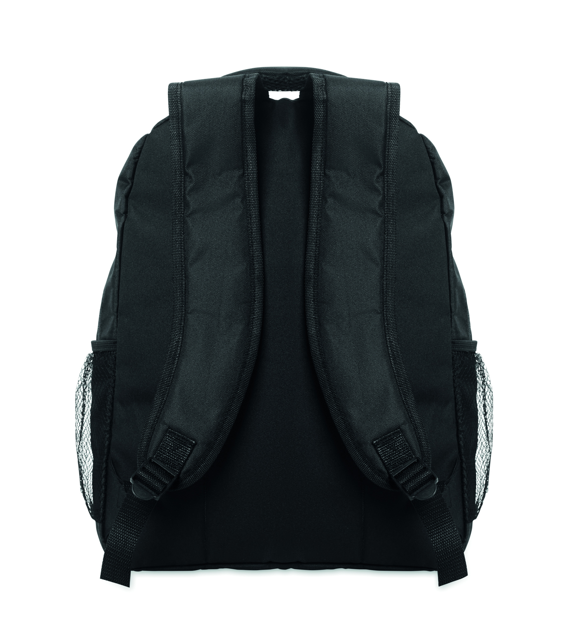 Laptop backpack 15inch in 600D RPET polyester with padded laptop compartment inside, mesh pockets on both sides and zippered front pocket.