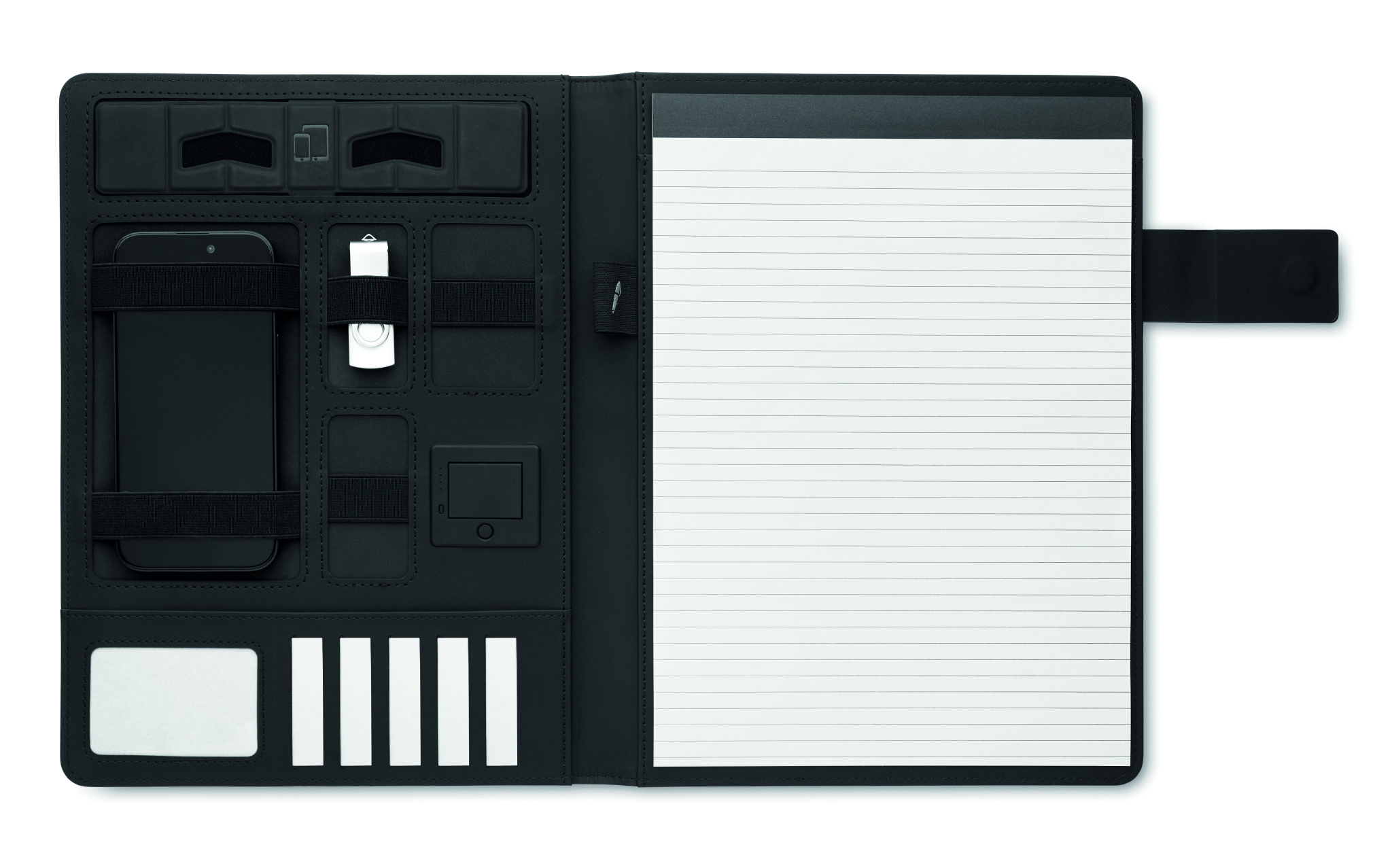 A4 conference folder with linen-PU cover. 5000 mAh power bank and 15W magnetic wireless charger. 20 lined sheets notepad. Multiple internal compartments. Magnetic closure. Elastic pen holder.