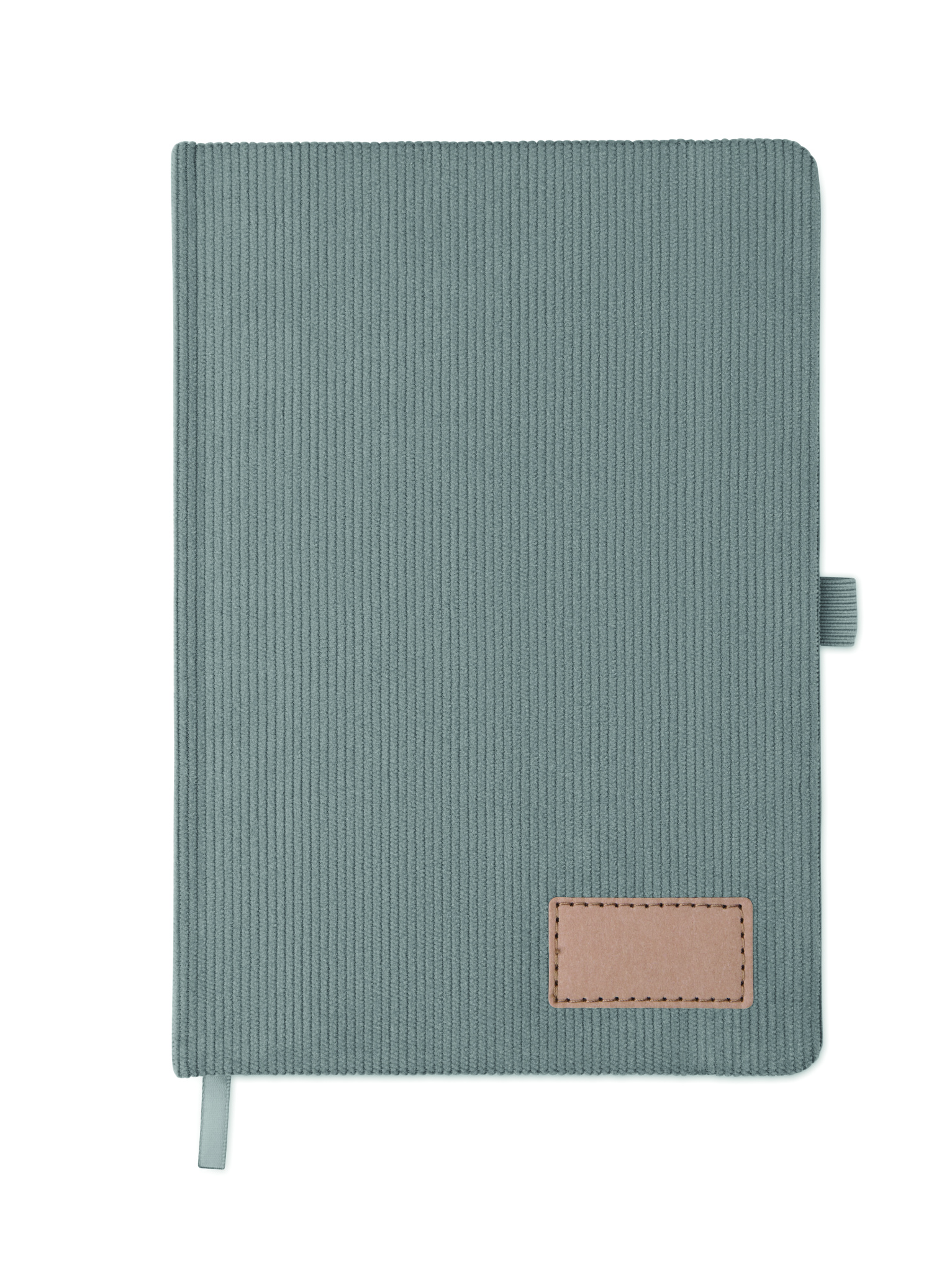 A5 notebook with hard RPET polyester corduroy cover and 192 lined recycled paper pages (70 gr/m2). Casebound design with elastic band closure, pen loop, ribbon page marker, and washed kraft paper tag.