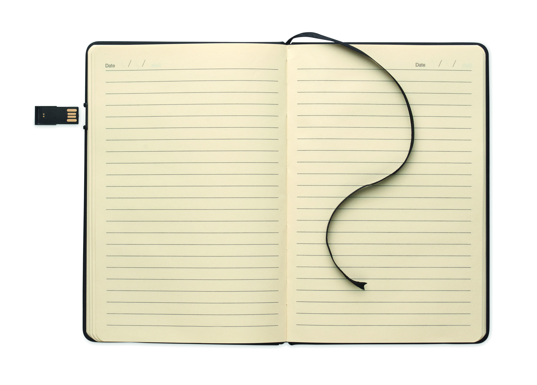 A5 notebook in hard cover made of 58% recycled polyester and 42% PU including integrated 16GB USB stick. Casebound. 160 lined recycled paper pages (80 sheets). Matching elastic closure strap and ribbon page-marker. FSC®-certified | FSC MIX CREDIT, P7.1, FSC-C213206
