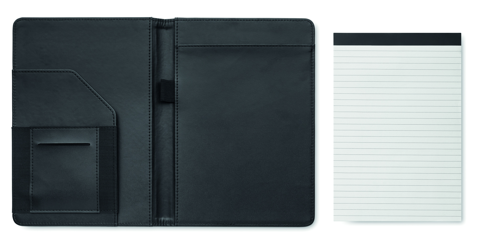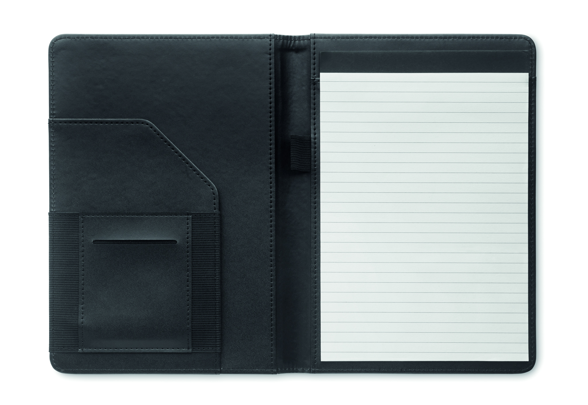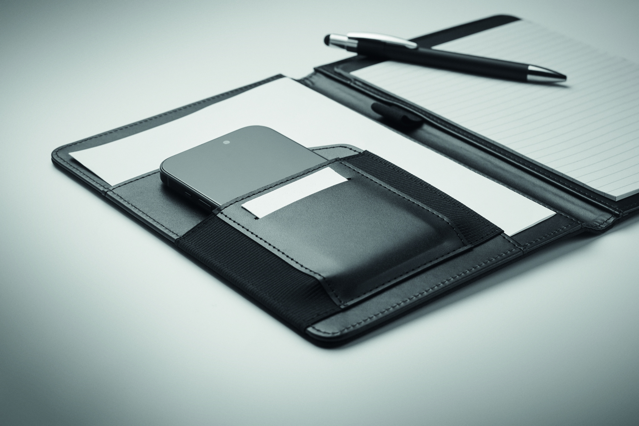A5 portfolio in 2 tone 300D RPET. Replaceable A5 notepad. 40 white lined bamboo paper pages (20 sheets). Pen holder. Cardholders inner side and one big compartment.