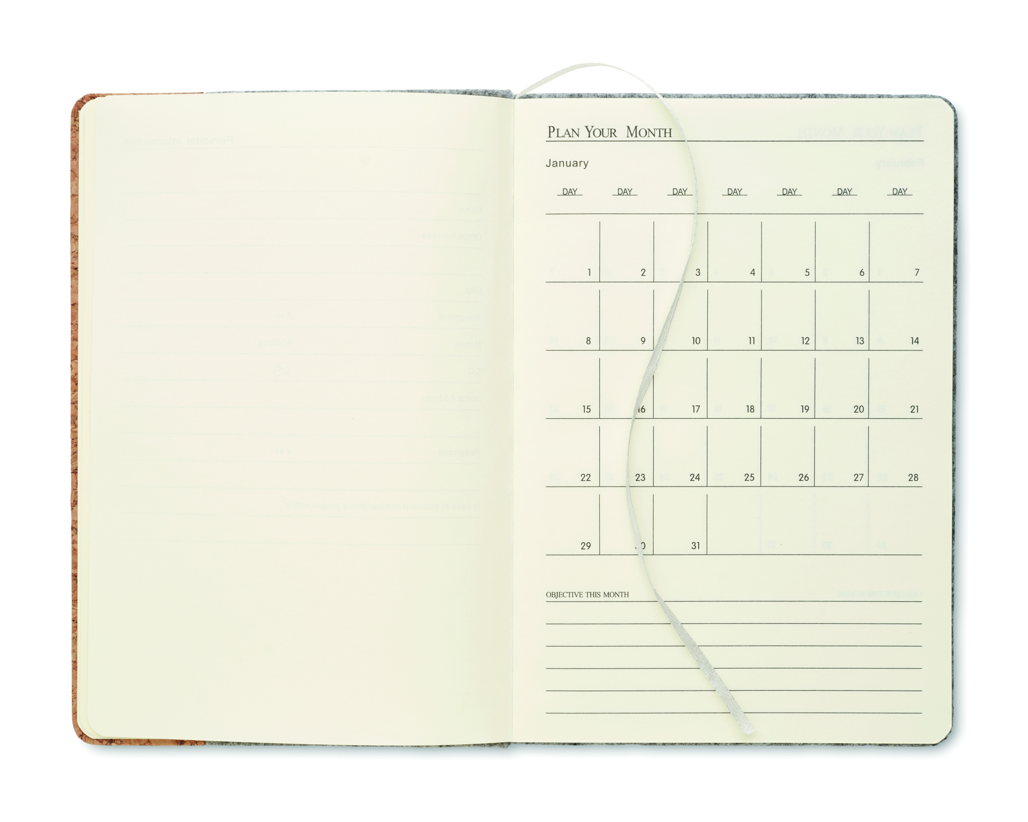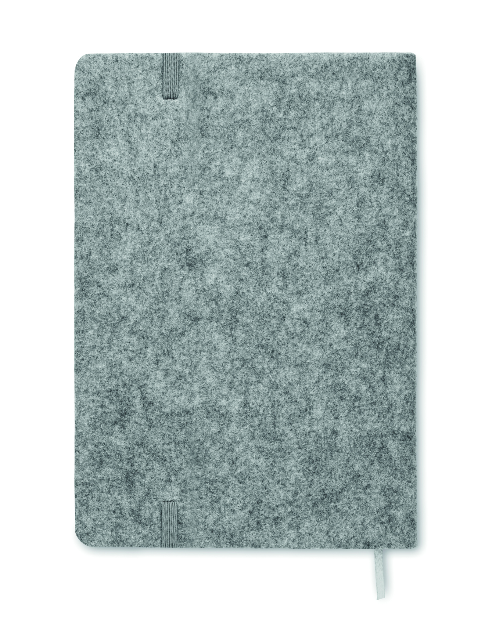 A5 notebook with RPET felt cover and cork. 160 recycled paper lined pages (80 sheets). Elasticated pen loop on front, matching elastic closure strap and ribbon page-marker.