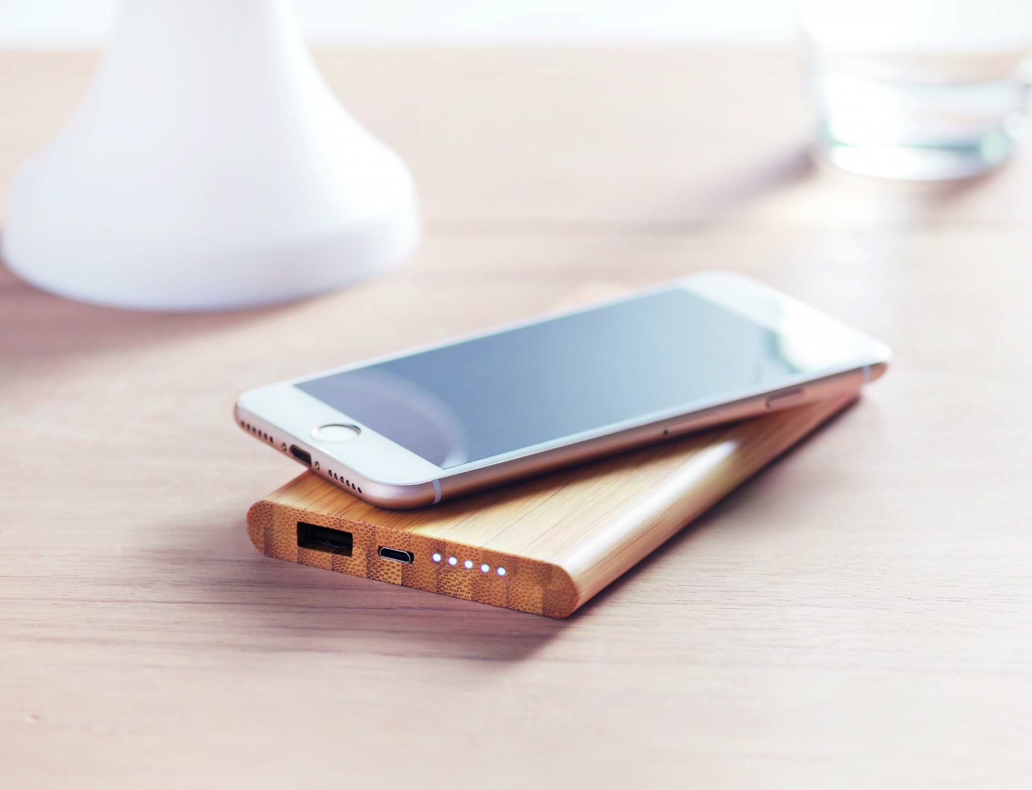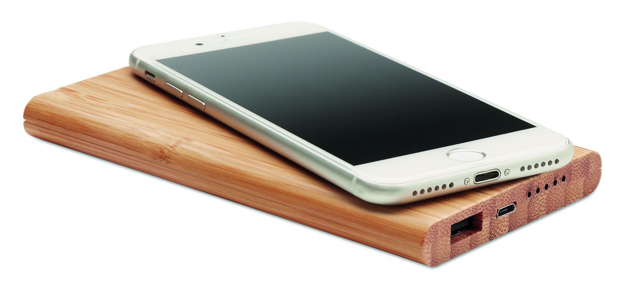 Беспроводная зарядка и аккумулятор на 6000 мАч в корпусе из бамбука. Оснащен разъемом тип C. Выходная мощность DC9V/1.66A (15W). Беспроводной выход: DC9V/1.66A (15W). Совместим с новейшими андроидами, iPhone® 8, X и новее.