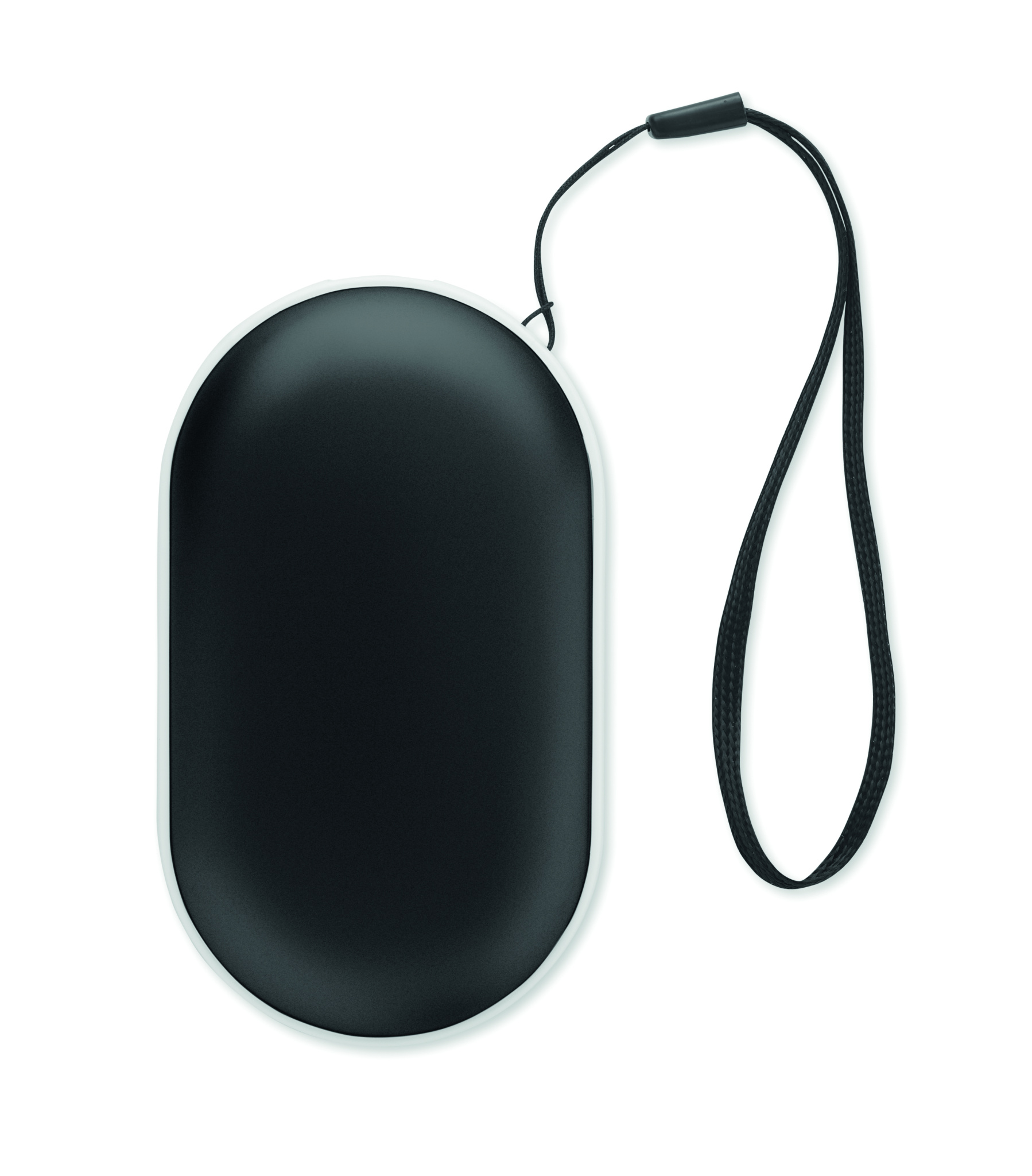 Aluminium electric hand warmer with 3 heat levels (45°C, 50°C, 55°C) and built-in 5000mAh power bank. Dual-sided heating, Type-C input/output, USB-A and DC5V/2A output and charging cable included.