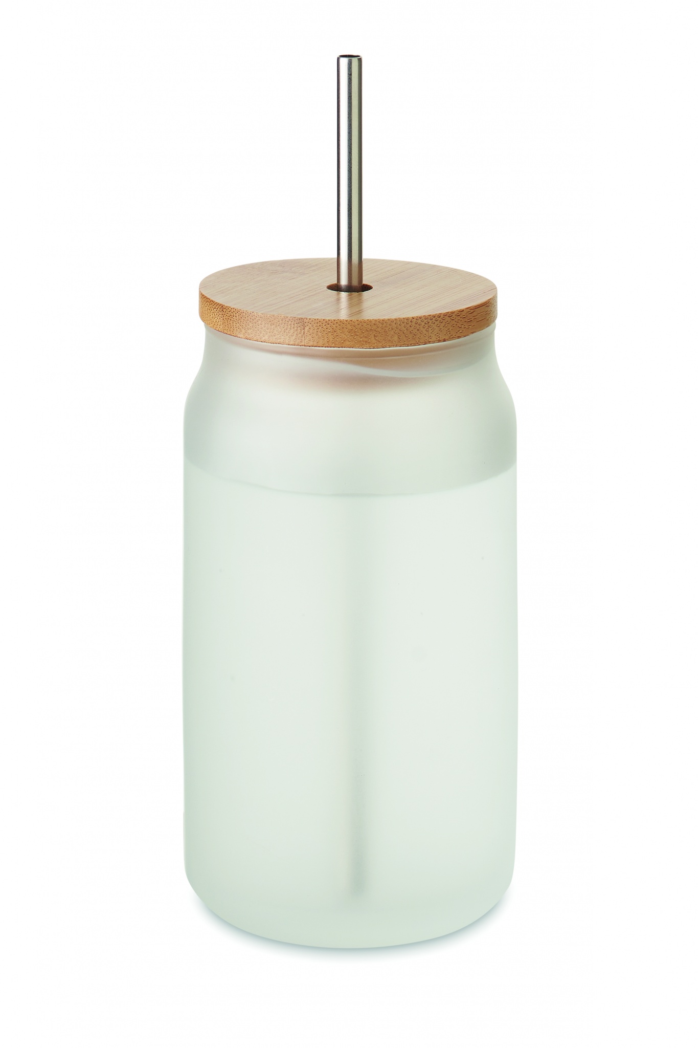 Емкость для коктейлей со специальным покрытием для сублимации с бамбуковой крышкой. В комплект входит соломинка из нержавеющей стали. Объем: 400 мл.