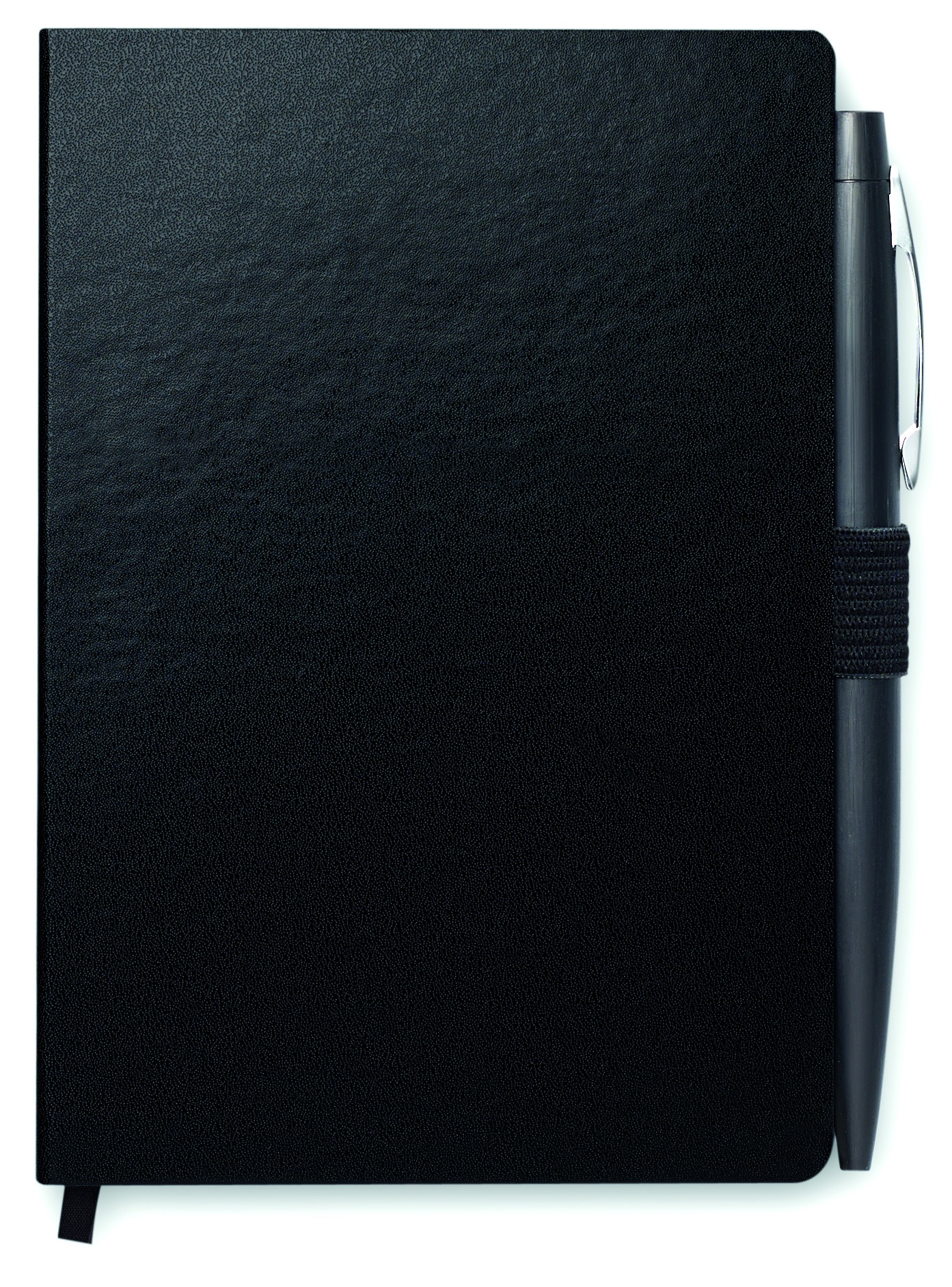 Блокнот A6 с обложкой из картона, 72 линованных листа, с лентой- закладкой, перетянут резинкой. Включает металлическую шариковую ручку с синими чернилами.