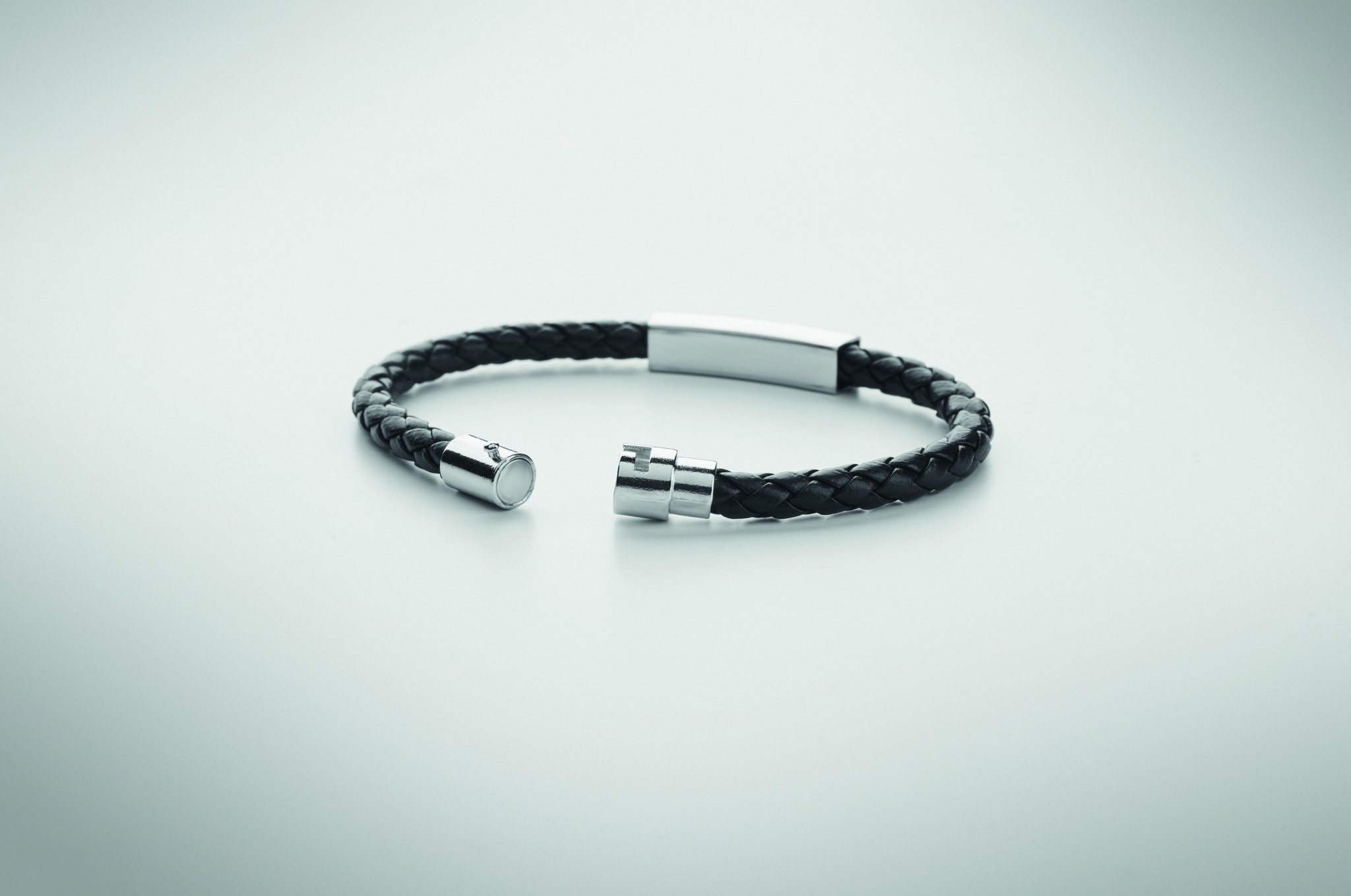 Плетеный браслет из искусственной кожи с фурнитурой из полированной стали. Застежка-защелка. Обхват запястья: 18 см.