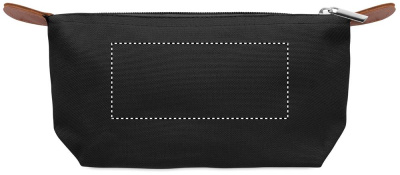 Cosmetic bag made of 600D RPET polyester with top zip closure and brown PU detail.