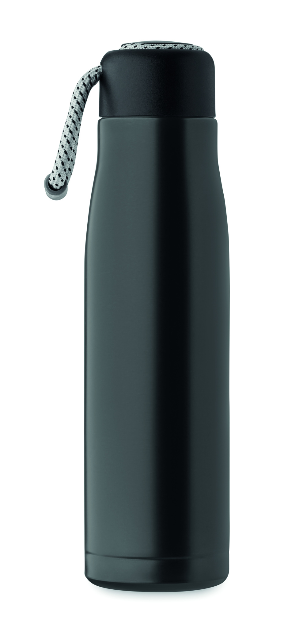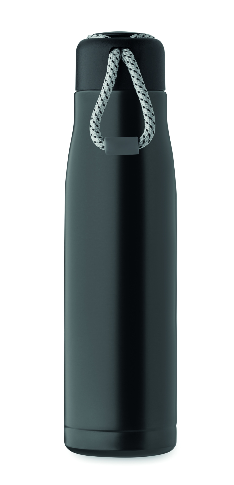 Double wall recycled stainless steel insulated vacuum bottle (90% recycled stainless steel and 10% stainless steel) with integrated cord grip on PP lid. Leak-free. Capacity: 500 ml.
