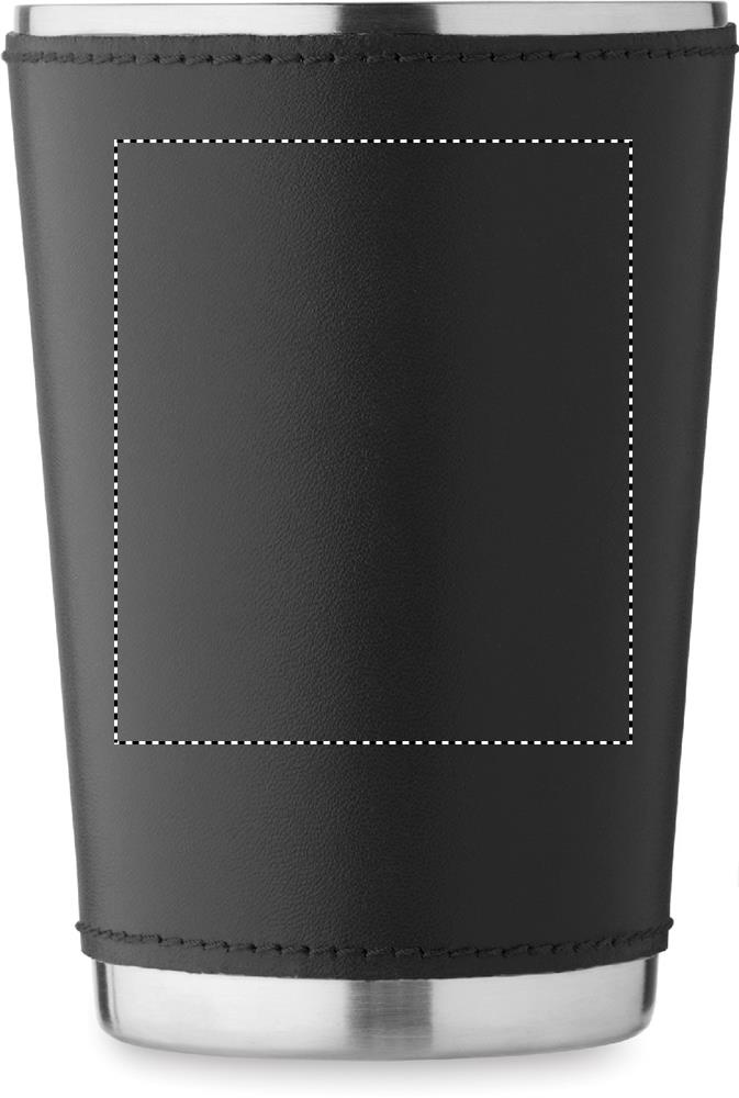 Double wall tumbler in recycled stainless steel (90% recycled stainless steel and 10% stainless steel) with removable PU leather sleeve. Lid with sliding sip hole. Leak-free. Capacity: 350 ml.