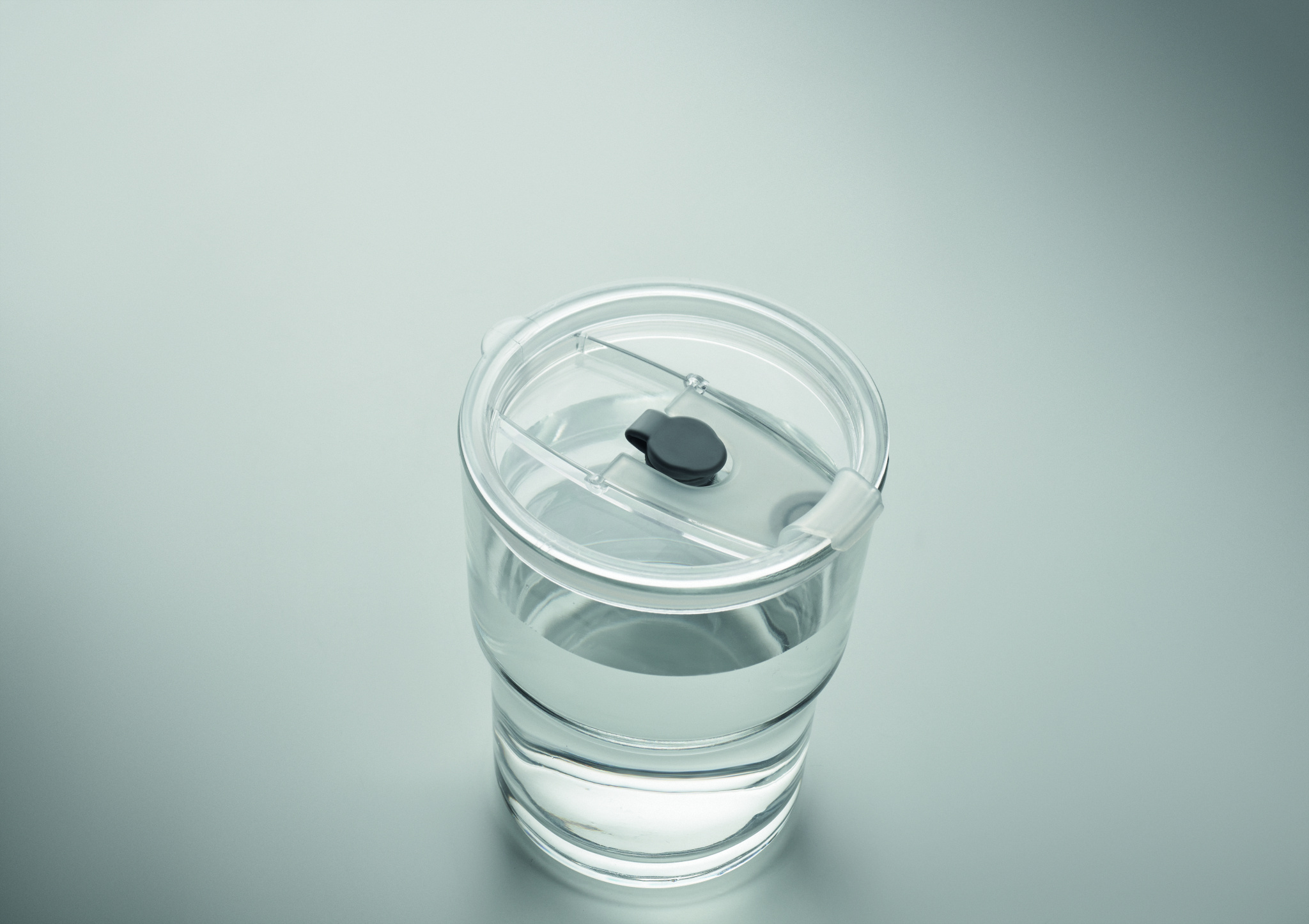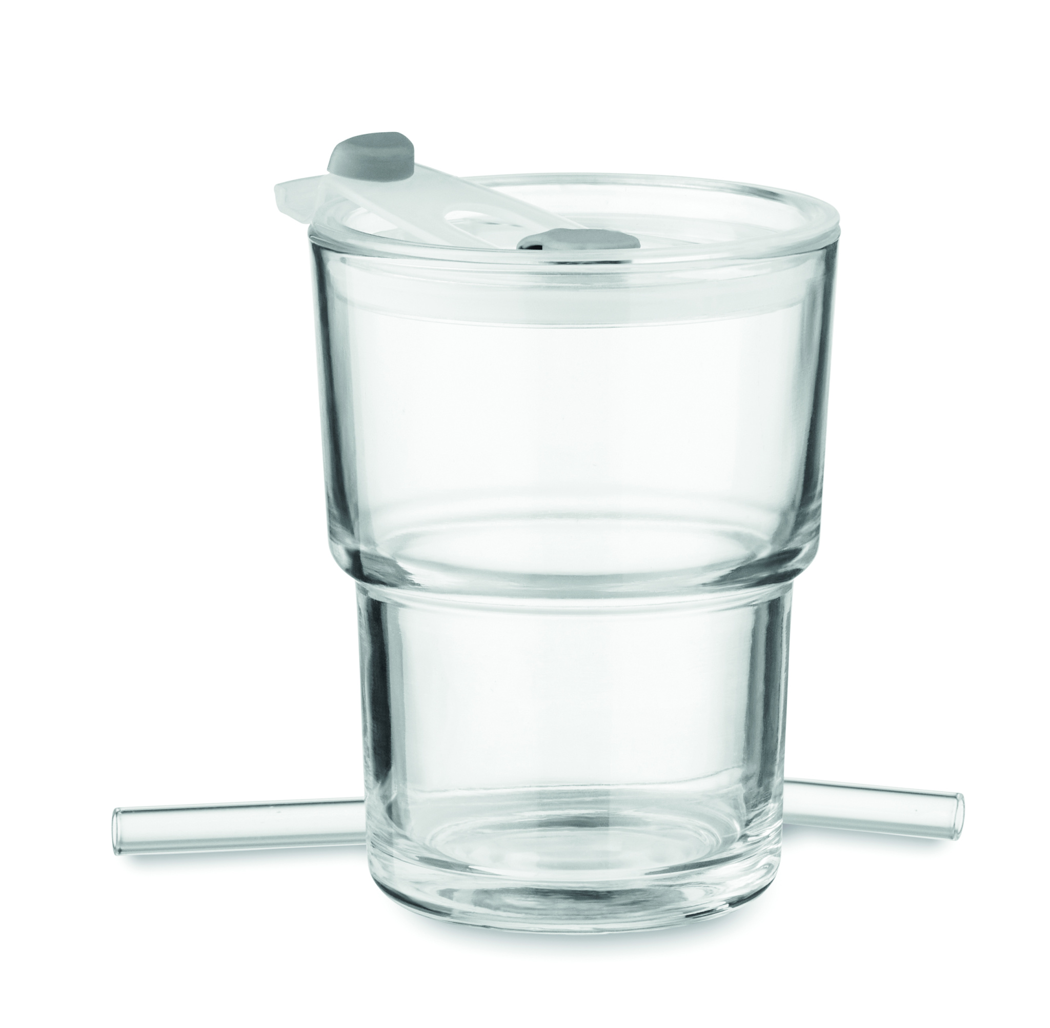 Glass tumbler with lid including removable glass straw. Straw socket and direct drink opening leak-free lid. Capacity 400 ml.