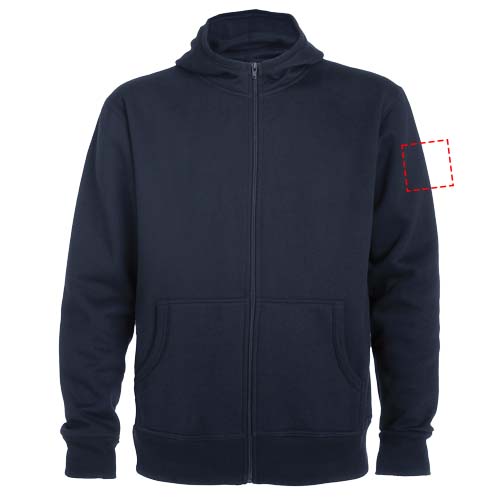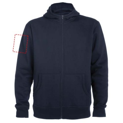 Худи с капюшоном, высоким воротником и полноразмерной молнией. Окантовка капюшона и карманов из ткани в рубчик. Карман-кенгуру. Манжеты рукавов и низ в рубчик 2 x 2. Съемная этикетка.