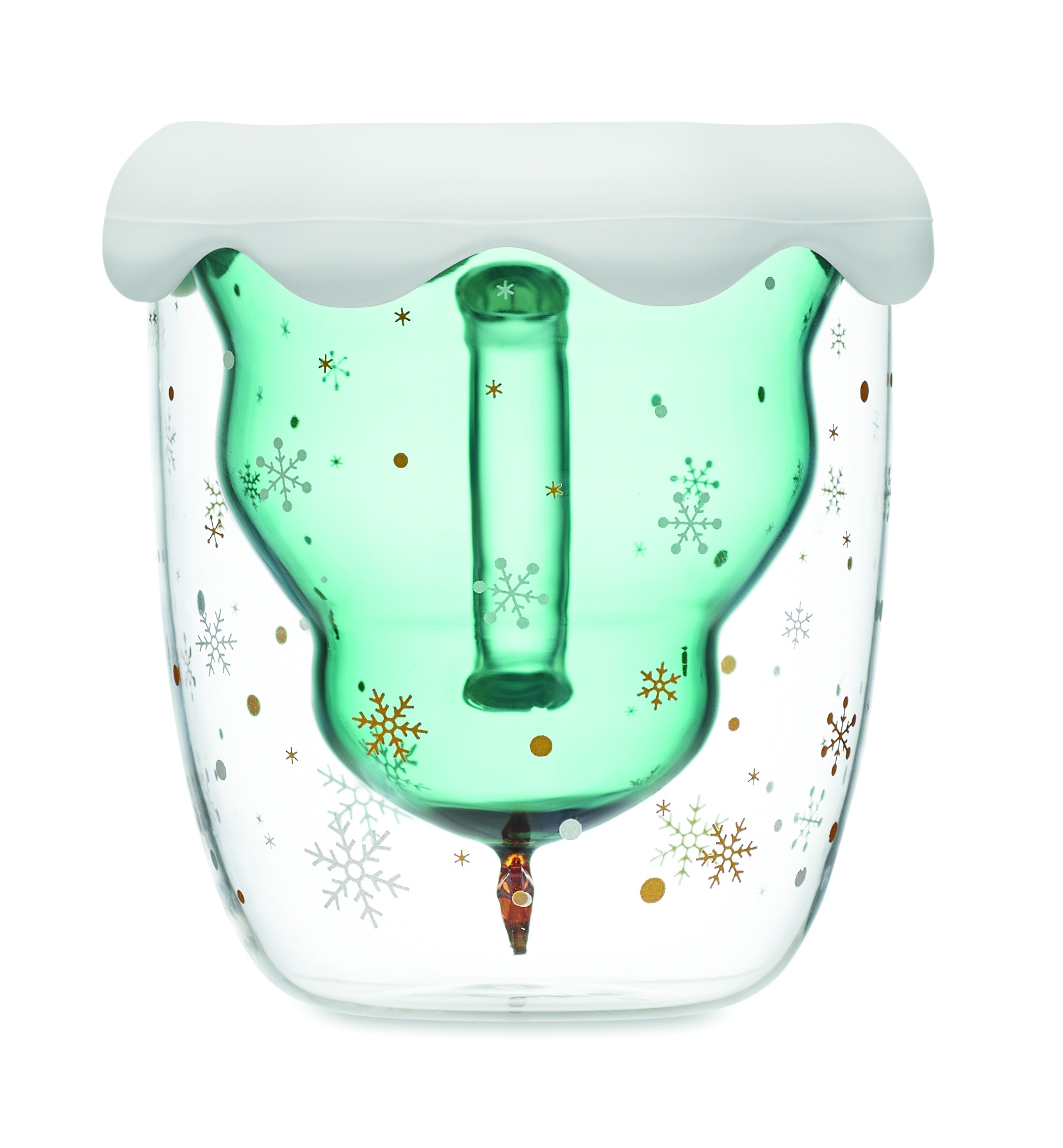 Кружка с двойными стенками из боросиликатного стекла с сезонным дизайном, силиконовой крышкой и подставкой. Объем: 250 мл.