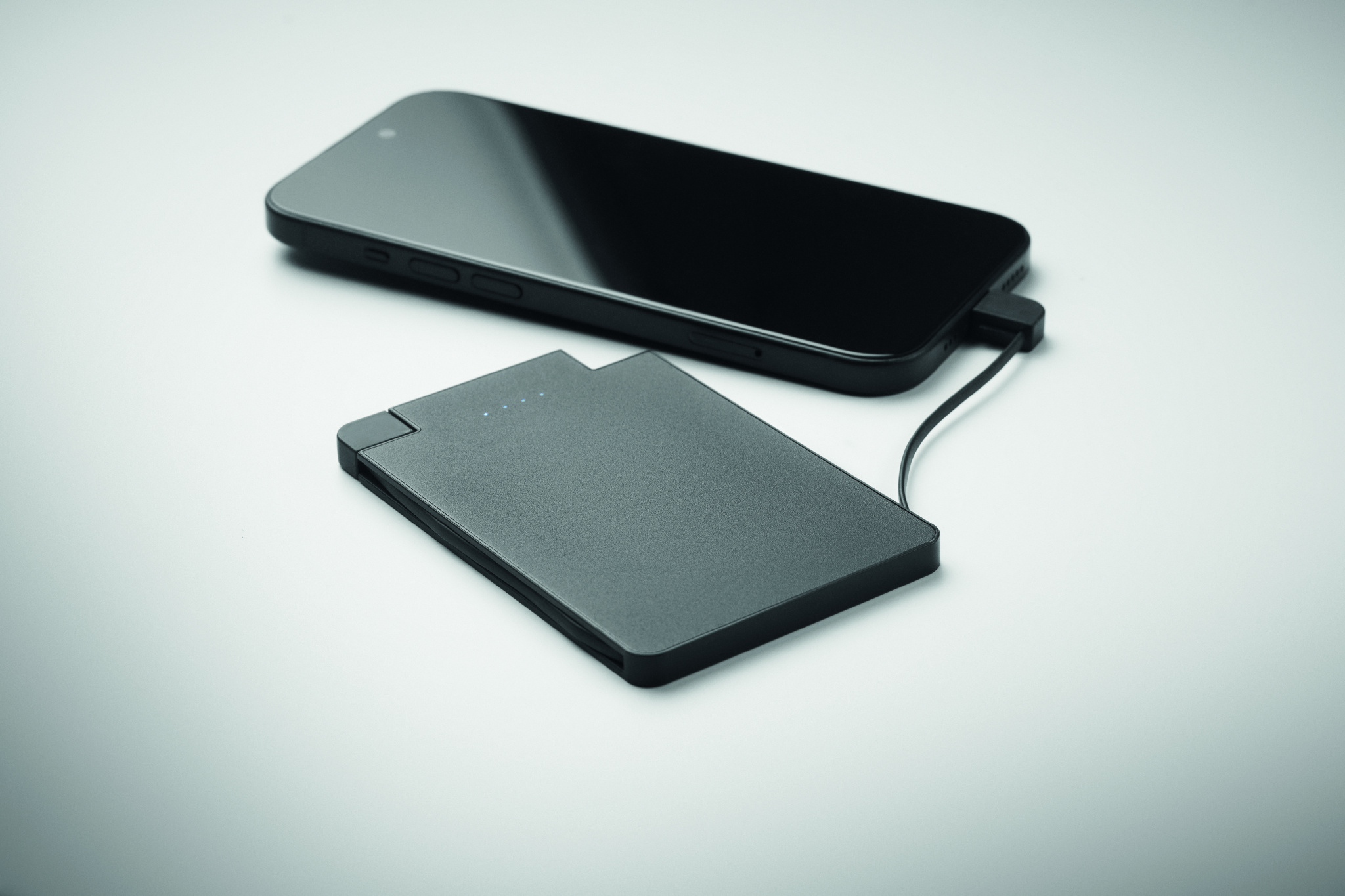 Card sized power bank 2500 mAh capacity in ABS with built-in cables. Powerbank sticks to magnetic featured iOs phones. Input: Type-C and output Type-C and IOS devices compatible.