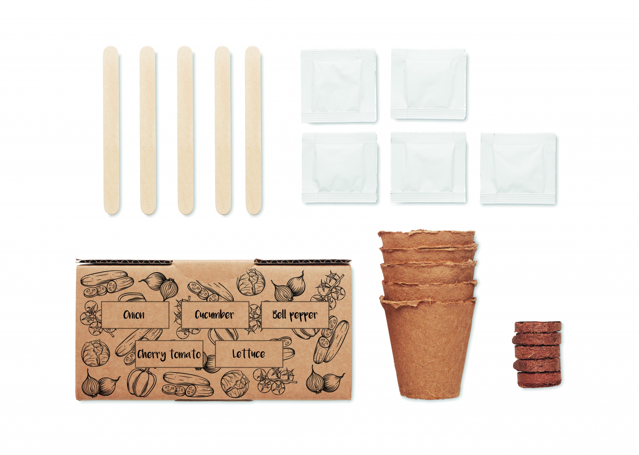 Набор для выращивания салата. Включает семена лука, огурца, болгарского перца, помидор черри и салата. Сделано в ЕС. Soil tablet included.